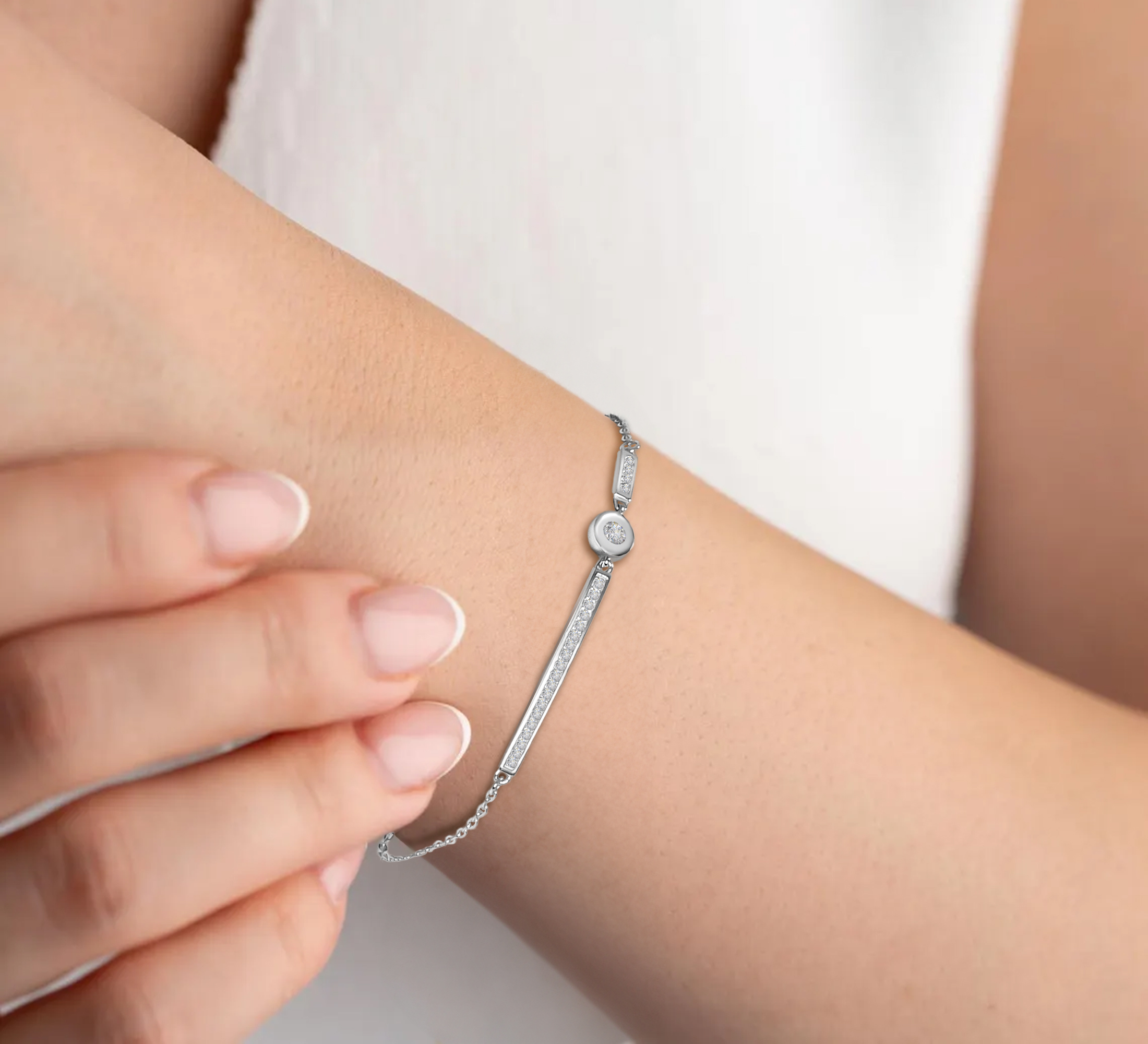 Refined minimalism meets radiant allure in the Aether Linea Solitaire Bracelet. A sleek pave bar and bezel set central stone anchor the piece with understated sophistication. Crafted in polished sterling silver, it offers a seamless blend of geometry and sparkle. Lightweight and versatile, this bracelet transitions from day to evening with quiet confidence, effortlessly elegant, eternally modern.