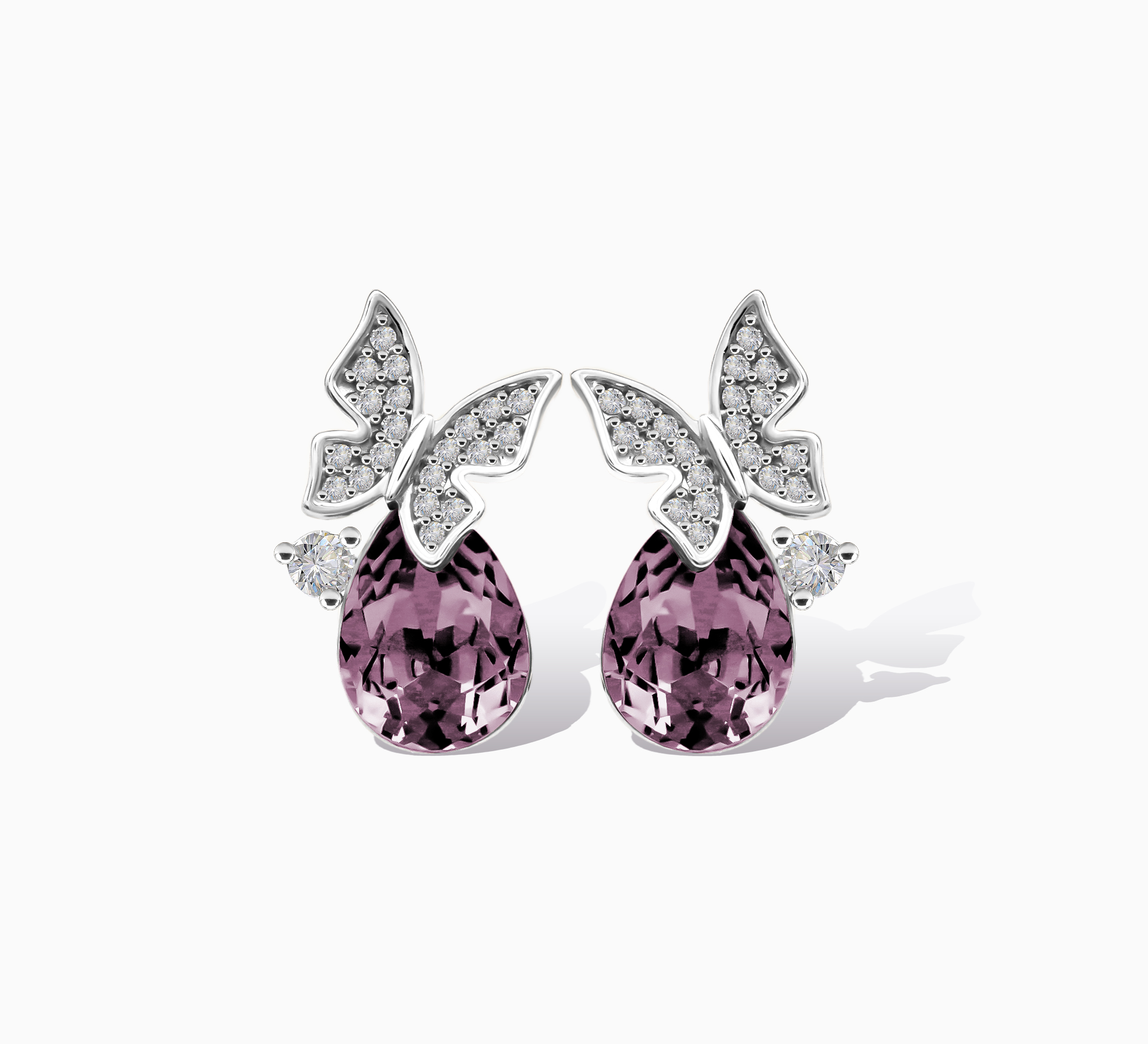 Elevate your jewellery collection with the Amara Wings Stud Earrings, a poetic blend of grace and glamor. Designed with shimmering lavender teardrop crystals and accented by butterfly inspired pave set wings, these earrings radiate elegance. The sterling silver finish enhances their refined charm. These silver crystal drop earrings are a versatile accessory that speaks to the soul of modern femininity.