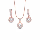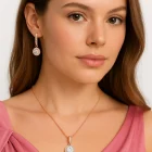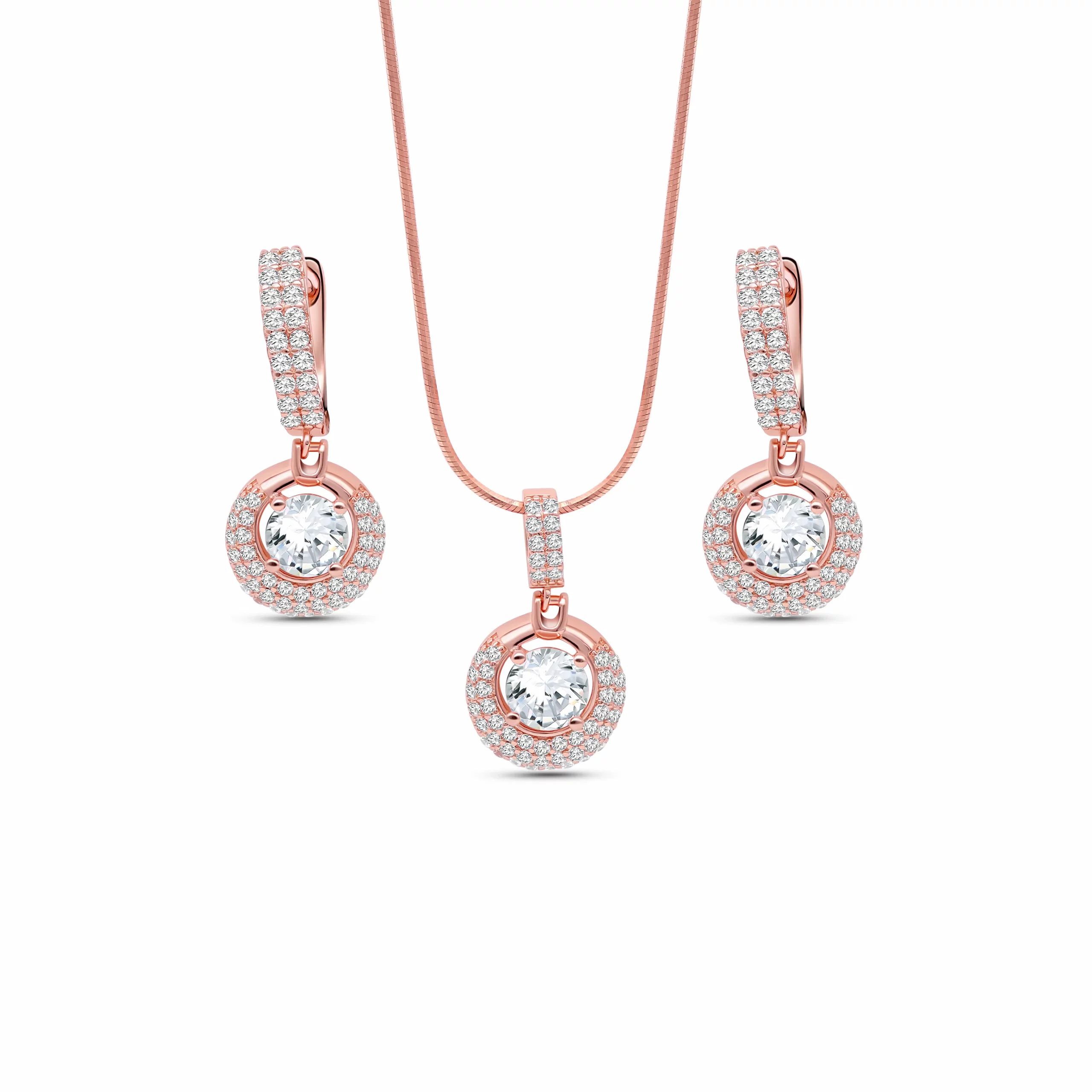 Shine with timeless grace in the Aurielle Luster Set, featuring a pendant and earrings in radiant rose gold. Dazzling cubic zirconia halos encircle a luminous central stone, creating a symphony of sparkle and refinement. Designed for the modern muse, this elegant trio is perfect for special evenings or everyday enchantment.