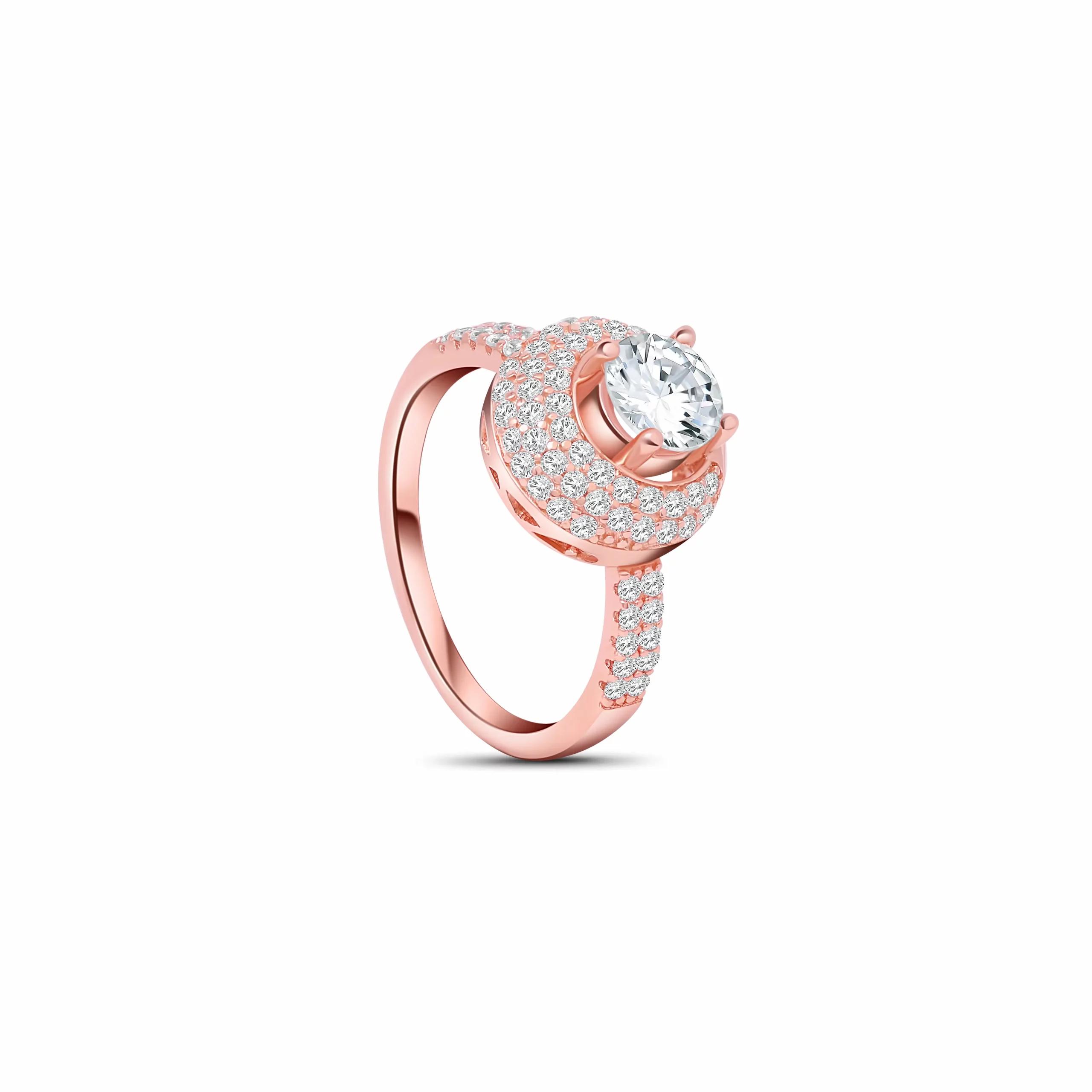 The Aurora Elan ring glows with the brilliance of starlight captured in rose gold. At its heart, a dazzling round cut center stone floats above a crescent of pave set brilliance like the moon cradling the sun.