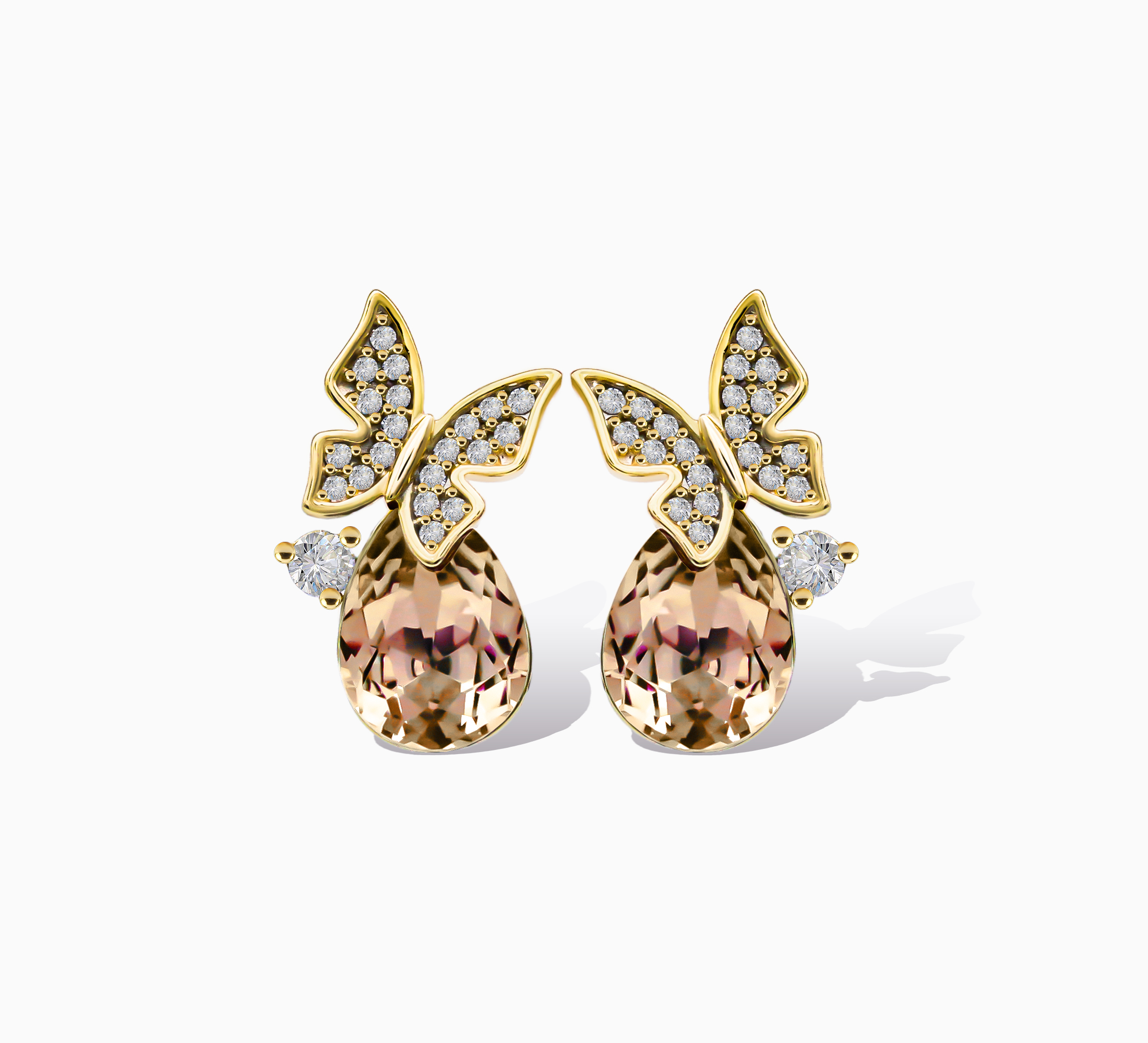Unveil the charm of transformation with the Aurora Papillon Stud Earrings, a celebration of light, movement and feminine elegance. These meticulously crafted gold plated butterfly stud earrings feature sculpted wings adorned with pave set cubic zirconia, gracefully poised above a pair of shimmering champagne hued teardrop crystals. Inspired by nature and designed for luminosity, the studs exude ethereal warmth with every glimmer.