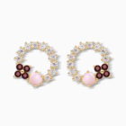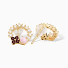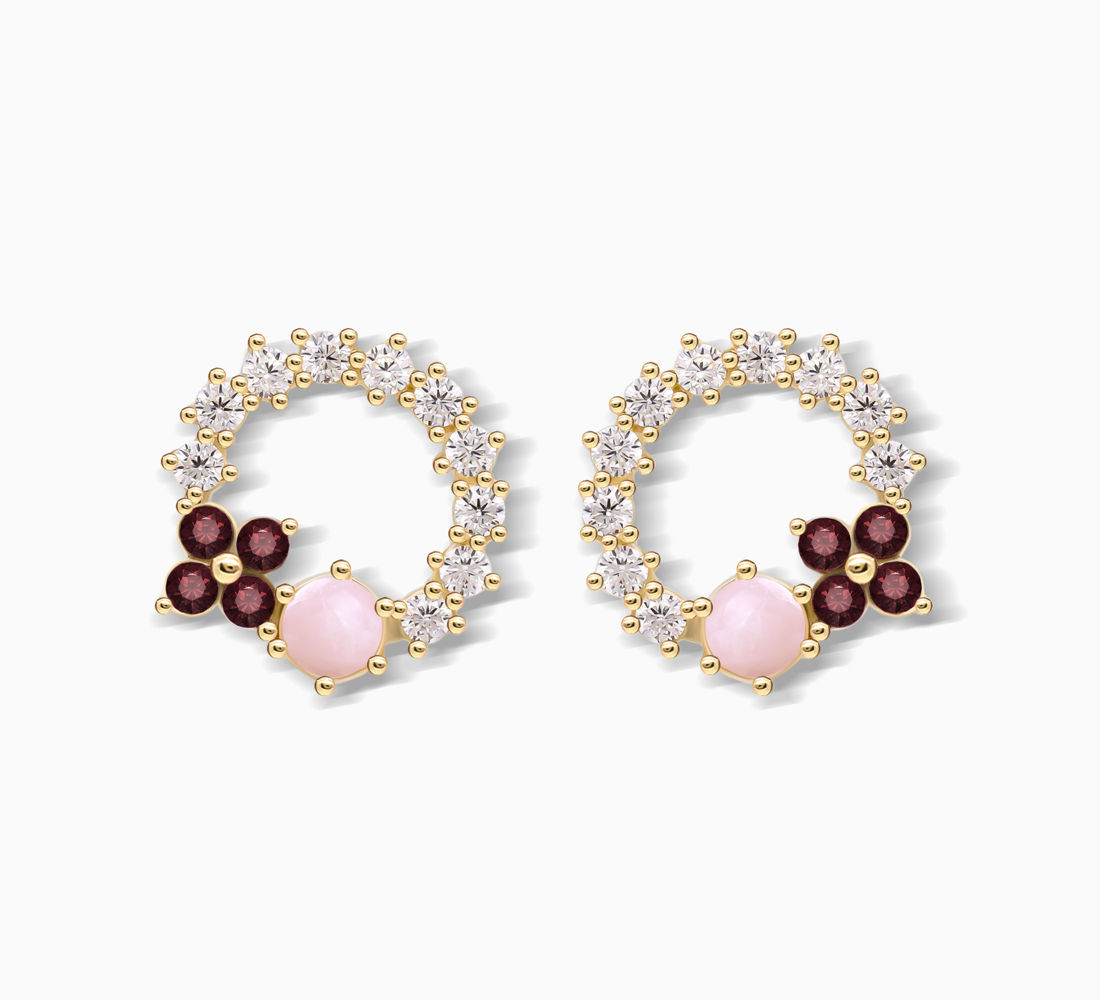 Step into spring with the Bloomlight Harmony Stud Earrings, where every detail whispers elegance. Set in gold plated sterling silver, these open circle studs are adorned with brilliant cut white cubic zirconia, accented by a soft pink stone and a trio of rich burgundy gems forming a petite flower.