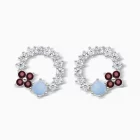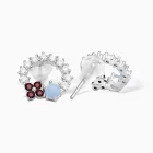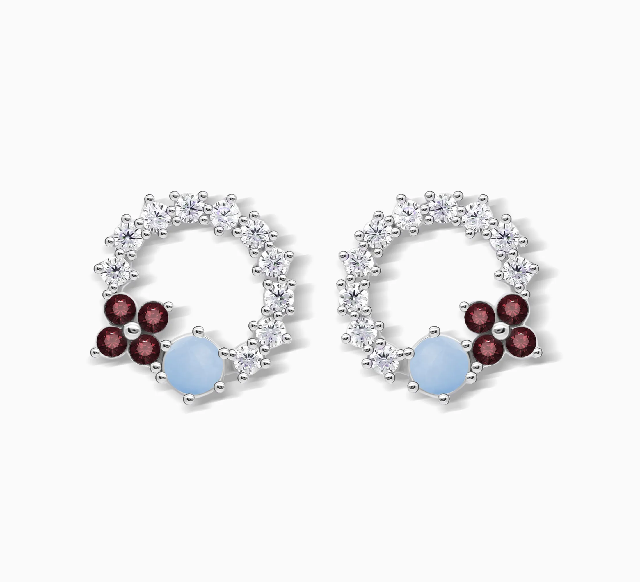 Fresh and fanciful, the Blueberry Bloom Stud Earrings bring a vibrant twist to a classic silhouette. Crafted in 925 Sterling Silver, these studs feature a sparkling ring of white cubic zirconia, complemented by a milky blue stone and four deep garnet hued crystals arranged as a petite flower.