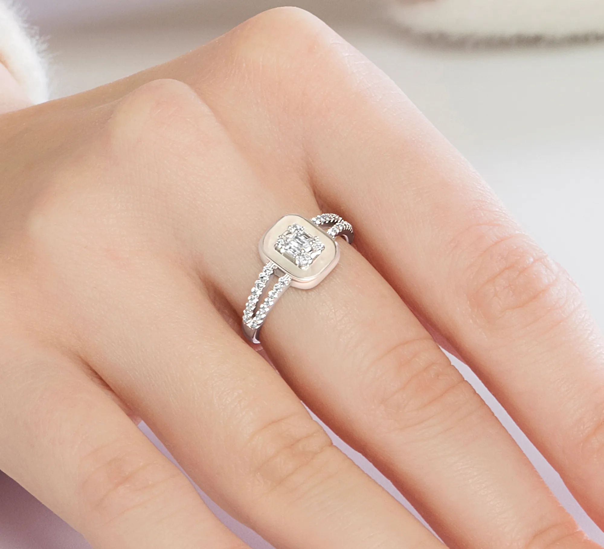 The Caelina Halo Ring is a masterclass in contemporary elegance. Crafted in hallmarked 925 sterling silver, it showcases a sparkling cubic zirconia center framed by a modern cushion inspired bezel halo for striking dimension. Split pave set shoulders add radiant brilliance, ensuring it captures the light and attention from every angle.