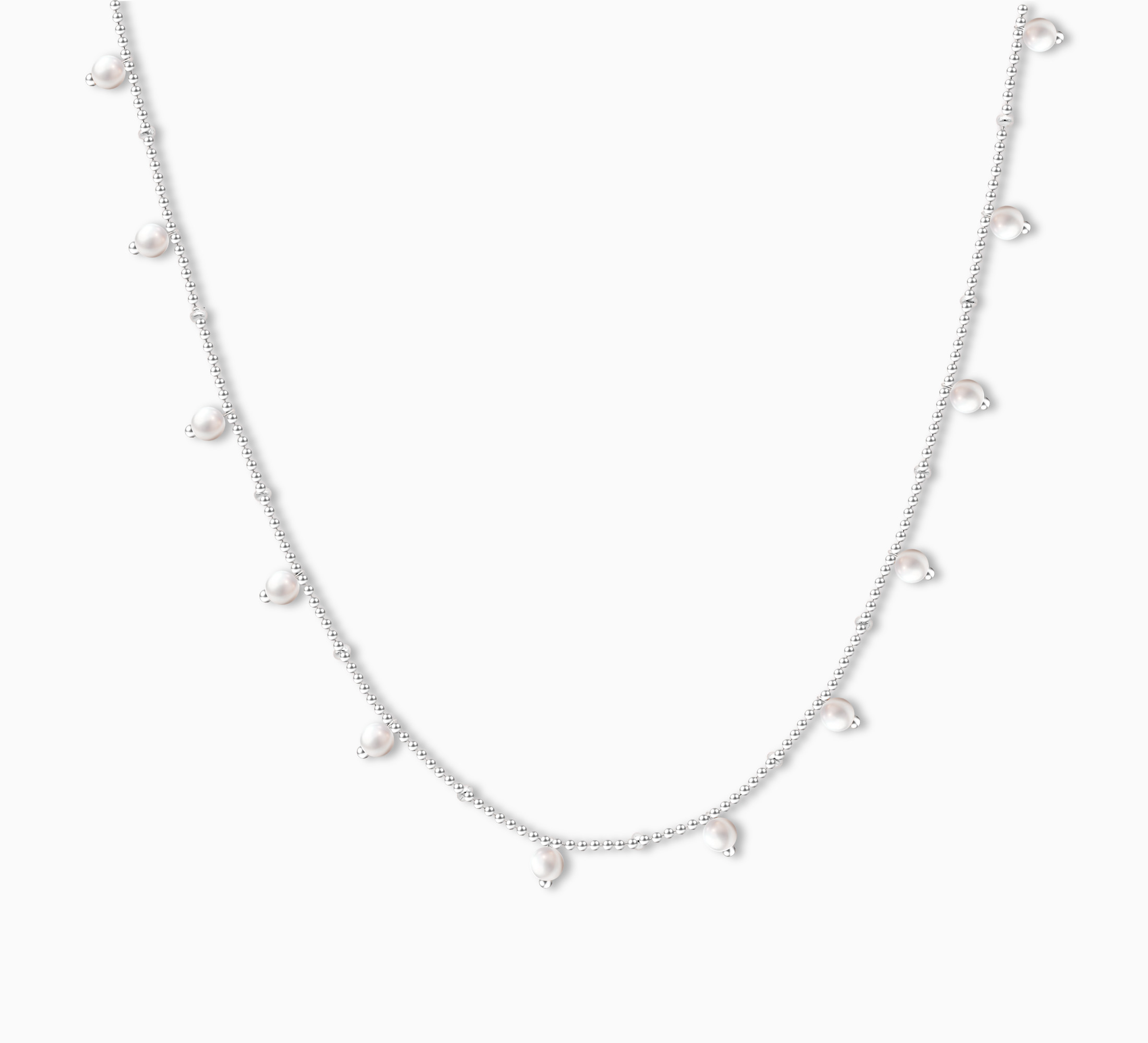 The Celene Pearl Necklace exudes ethereal grace with its delicate silver chain adorned by luminous immitation pearls. Each teardrop shaped pearl dances with movement, evoking soft raindrops on moonlight. Expertly spaced for fluid elegance, this necklace offers timeless sophistication, whether worn alone or layered for elevated charm. Perfect for day to evening transitions with understated luxury.