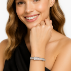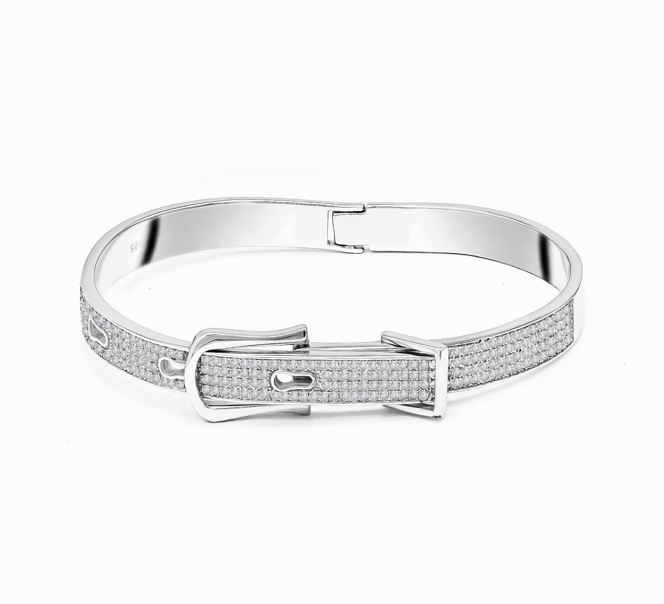 The Celeste Buckle Bracelet fuses timeless design with radiant impact. Meticulously crafted in sterling silver, its sculptural belt buckle silhouette is adorned with hundreds of pave set cubic zirconia, creating a captivating play of light. This iconic piece speaks of bold femininity and polished power, perfect for stacking or standing alone. A dazzling expression of confidence, elegance and individuality.