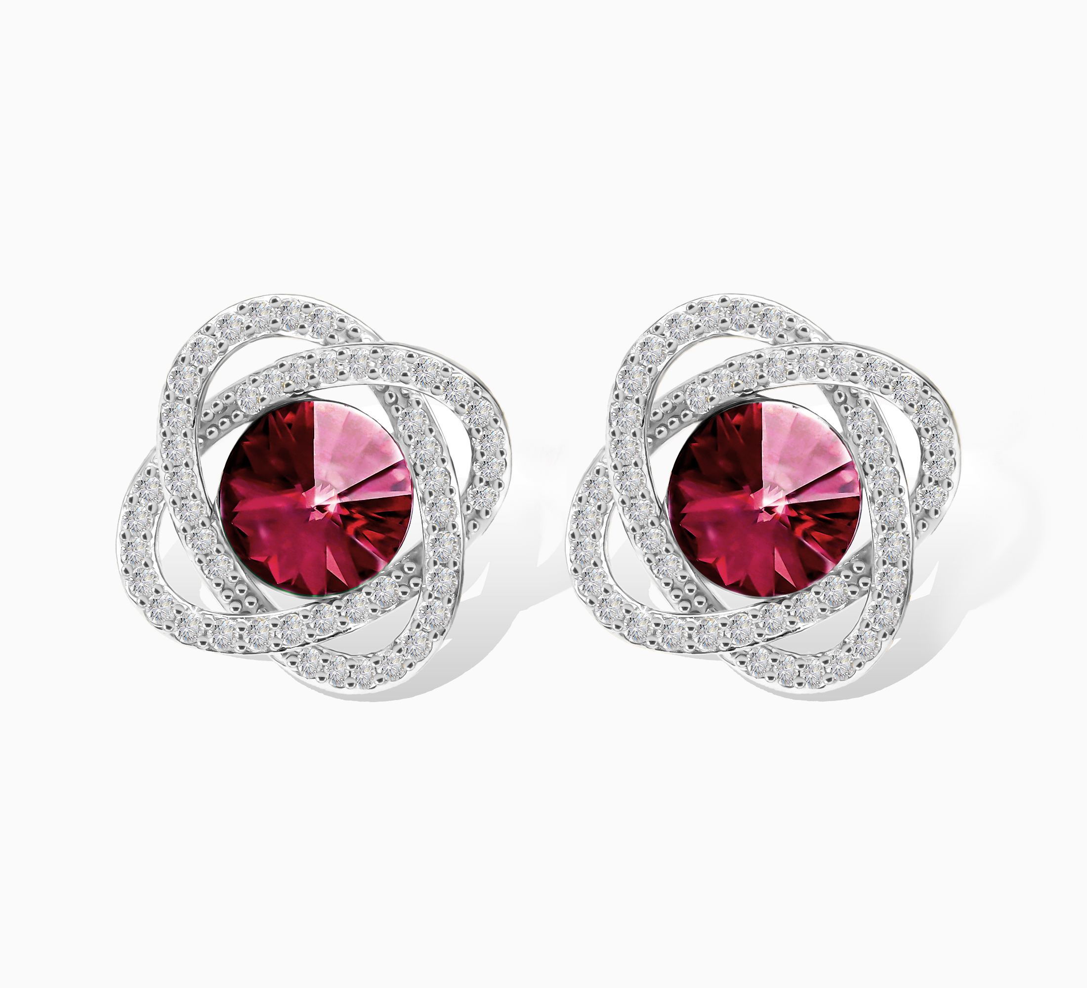 Ignite your inner brilliance with the Celestia Rouge Stud Earrings a dazzling tribute to celestial design and timeless sophistication. A radiant ruby toned round cut cubic zirconia is nestled within interlacing pave set silver tone loops, creating a silhouette that echoes the elegance of starbursts and orbits. These stud earrings are a perfect fusion of modern luxury and cosmic inspiration, ideal for evening wear or a refined everyday accent. With their rich colour and intricate form, they bring drama, elegance and light to every occasion.