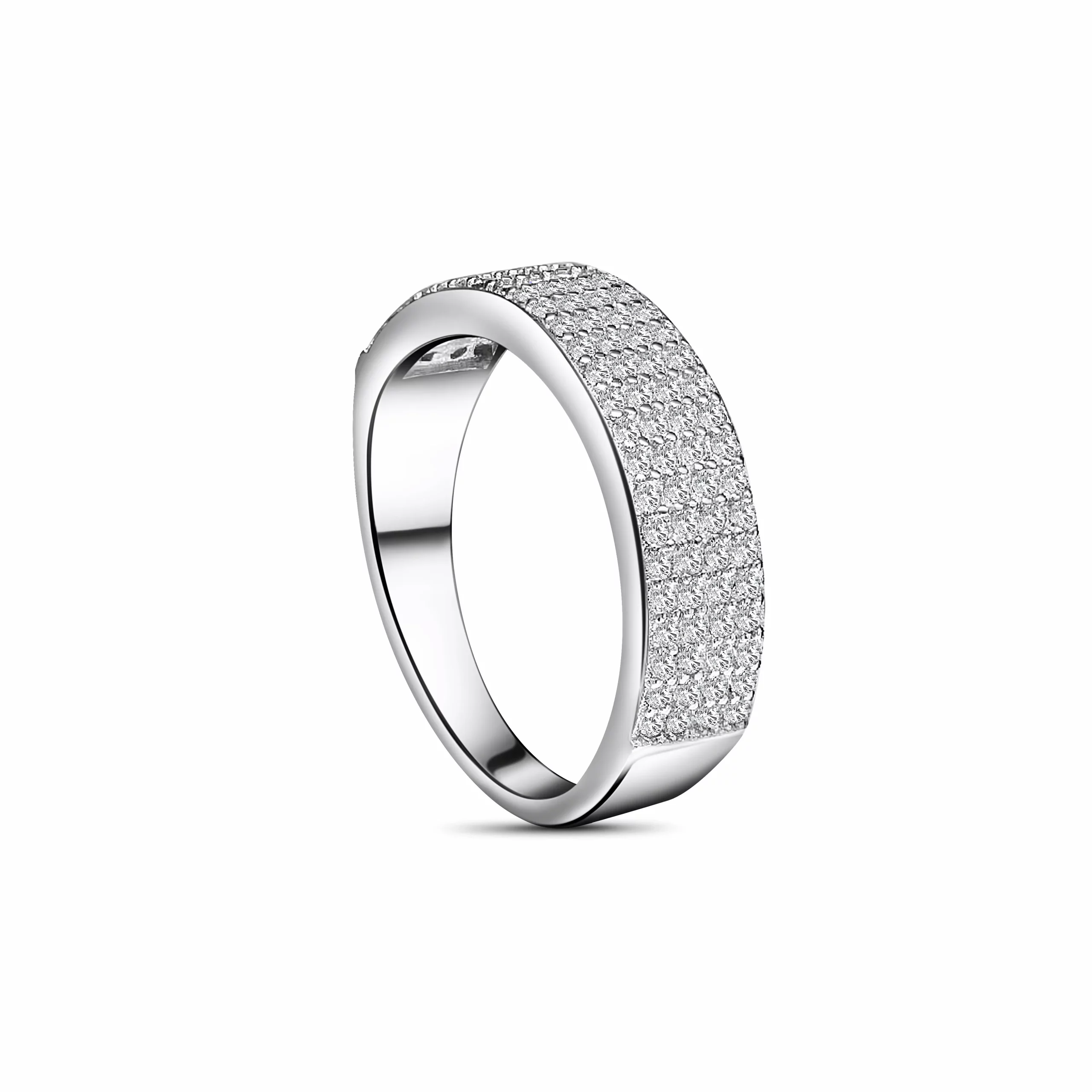 The Celestial Pave Band exudes a refined brilliance inspired by starlit skies. Its broad, gently curved profile is paved with countless micro set clear cubic zirconia stones that shimmer with every movement, creating a dazzling, endless sparkle.