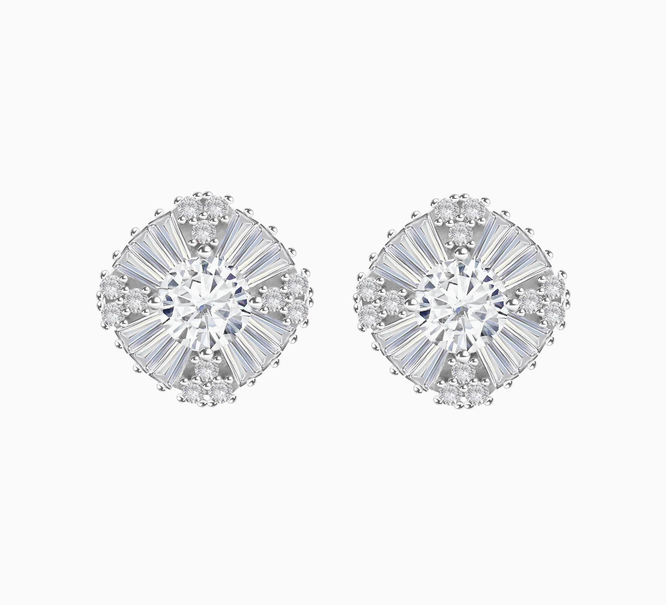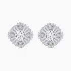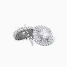The Celestique Spark Stud Earrings are designed to glow like stardust. At the heart lies a high clarity round cut cubic zirconia, surrounded by alternating spokes of tapered baguettes and clustered stones, forming a sculptural bloom of light. The geometric harmony creates depth and dimension, catching light with every move.