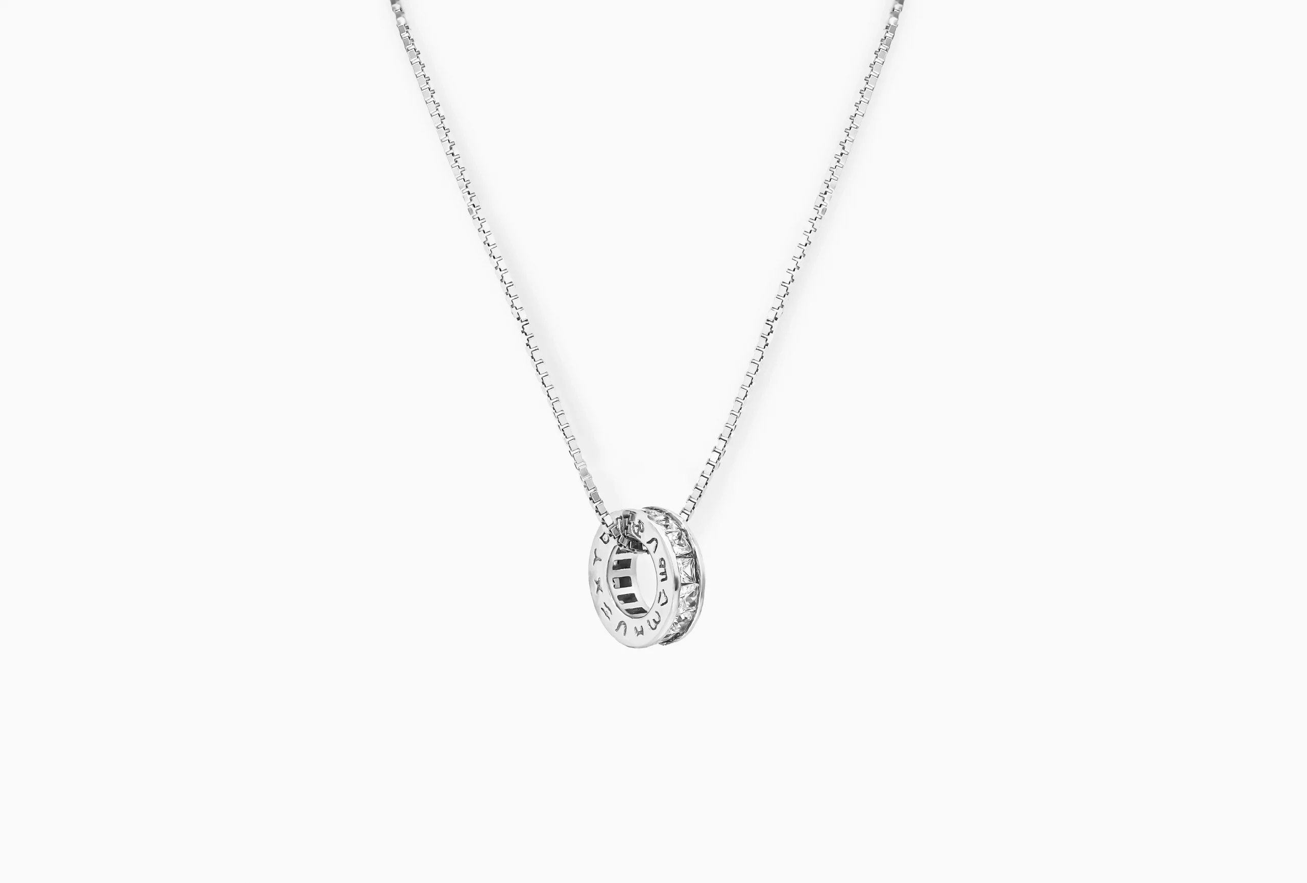 A little kinetic magic for your neckline. The Cipher Orbit Spinner Pendant stacks two circles in cool 925 sterling silver, an outer ring etched with subtle lettering and an inner ring set with a sleek row of cubic zirconia. It’s the modern everyday pendant that looks luxe on its own and layers like a dream.