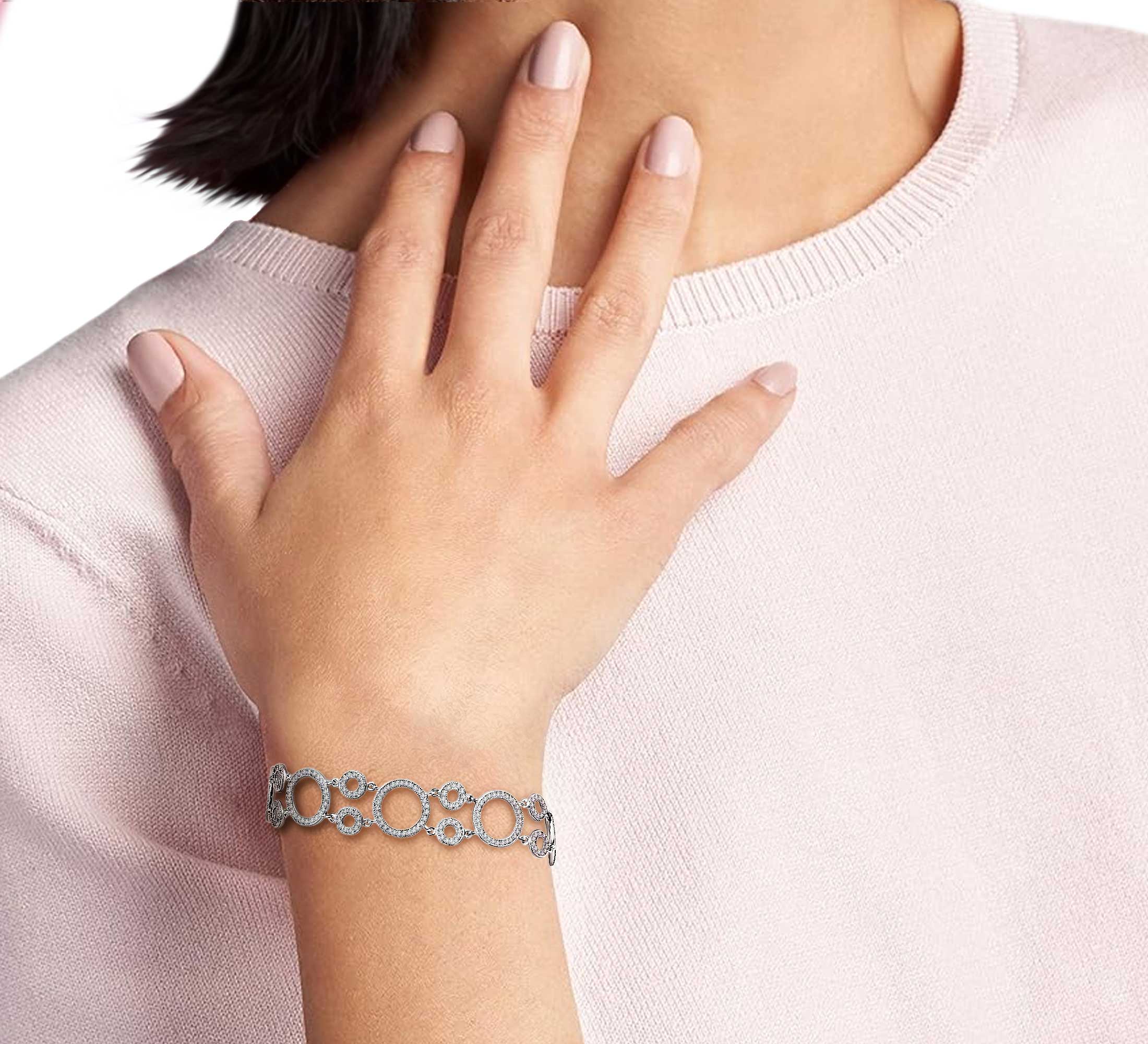 The Cirque Elegance Bracelet offers a graceful interplay of light and form. Crafted in radiant sterling silver, its open circle design is adorned with pave set cubic zirconia for a refined sparkle. Effortlessly bold yet feminine, it drapes the wrist in a pattern of modern symmetry and elegance.