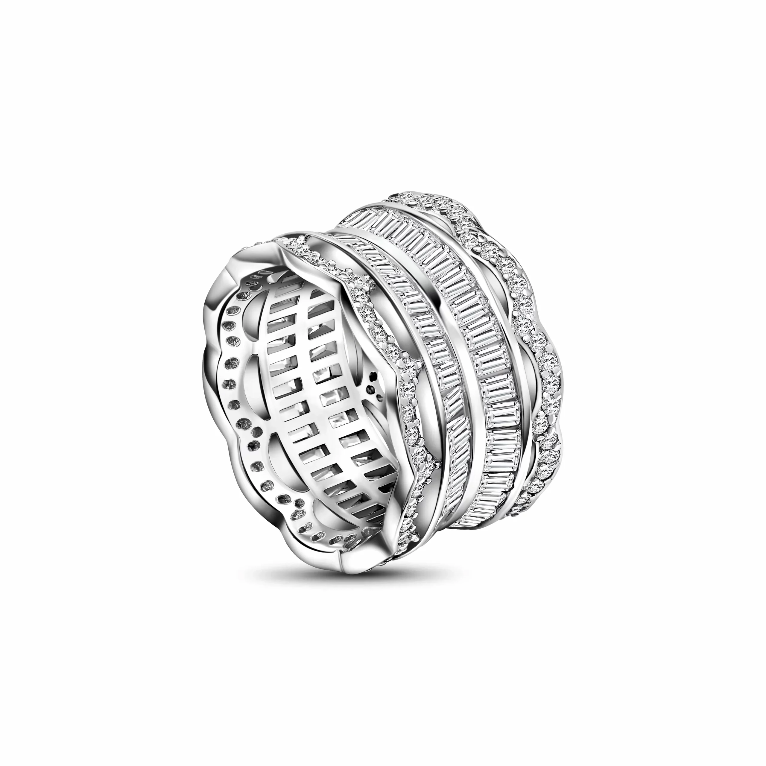 The Coralia Curve Band Ring is a masterful blend of sculptural design and radiant luxury. Crafted in hallmarked 925 sterling silver, its bold, layered silhouette features interwoven wave like bands set with shimmering pave and baguette cut cubic zirconia for multidimensional brilliance.
