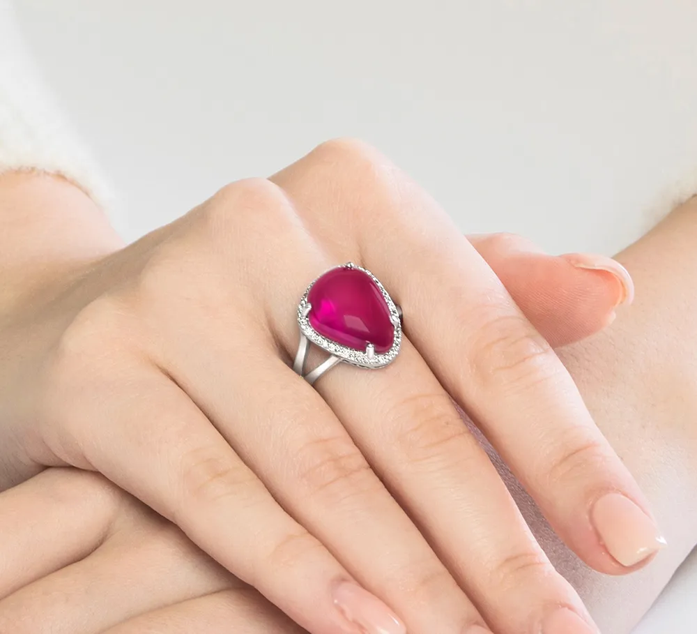 The Crimson Mirage Cabochon Ring enchants with sculptural grace and bold, luminous colour. Featuring a large, teardrop shaped crimson cabochon stone polished to a mirror like sheen, it sits securely within a sleek sterling silver split shank setting accented with a delicate halo of clear cubic zirconia. The design feels fluid and modern while exuding classic romance.