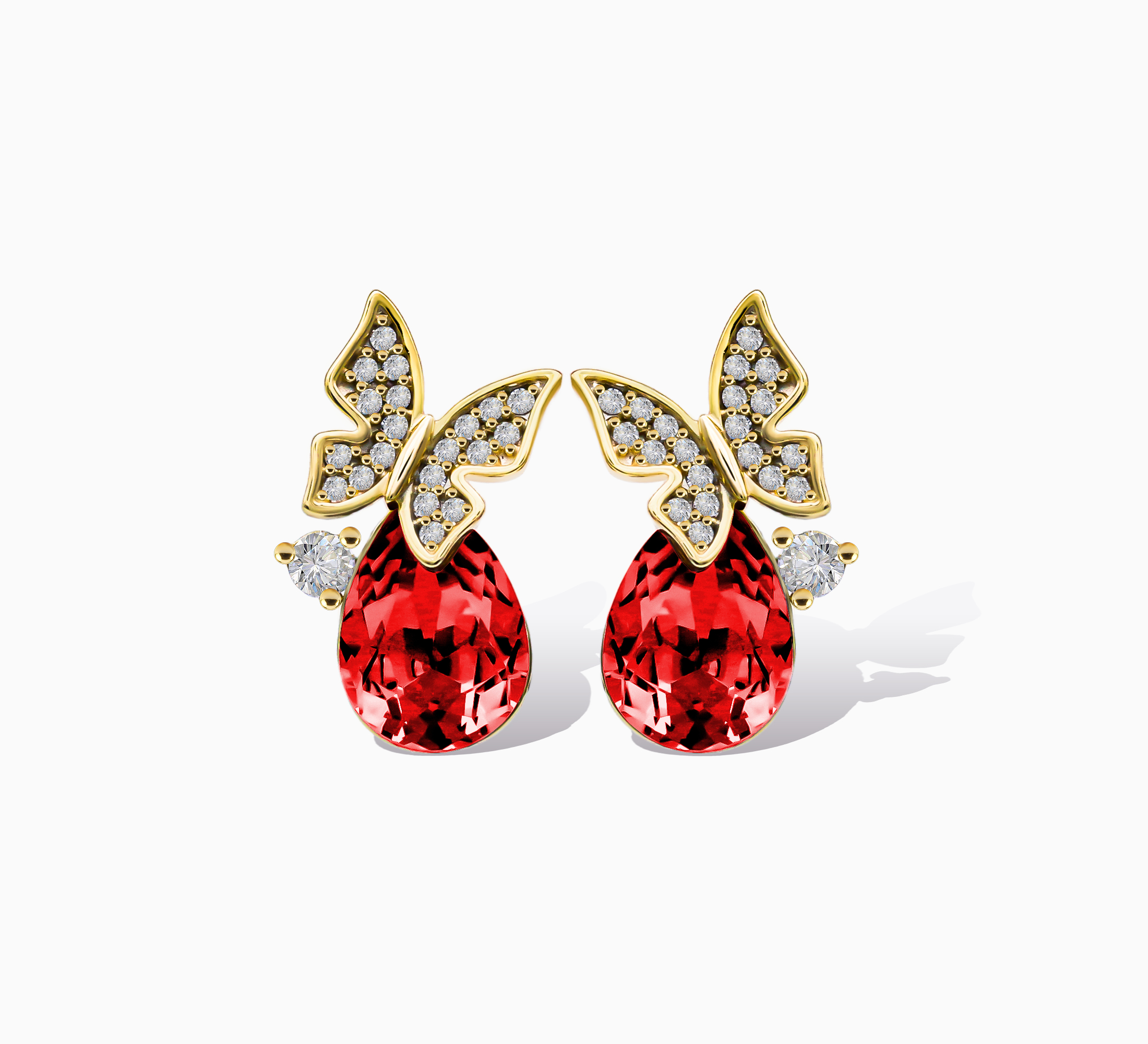 Command attention with the fiery elegance of the Crimson Monarch Stud Earrings a bold fusion of romance and regality. Crafted in radiant gold tone metal, these butterfly drop stud earrings feature intricately detailed wings set with brilliant cut zirconia, paired with dramatic red teardrop that catch the light with every movement. Whether worn for a romantic evening or a festive occasion, these statement butterfly earrings make a powerful impression with their vivid colour and luxe sparkle.