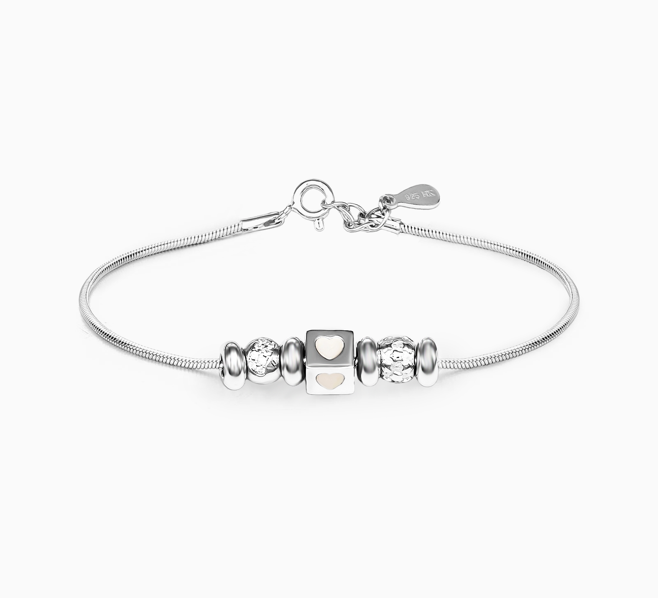 Crafted from high polish sterling silver, the Cubic Embrace bracelet combines modern elegance with sentimental charm. It features a snake chain design adorned with textured spacer beads and a central cube charm showcasing heart motifs in warm gold tone accents. Secure and comfortable with a classic lobster clasp, this bracelet is perfect for layering or wearing solo. A meaningful piece for everyday luxury or gifting someone special.