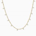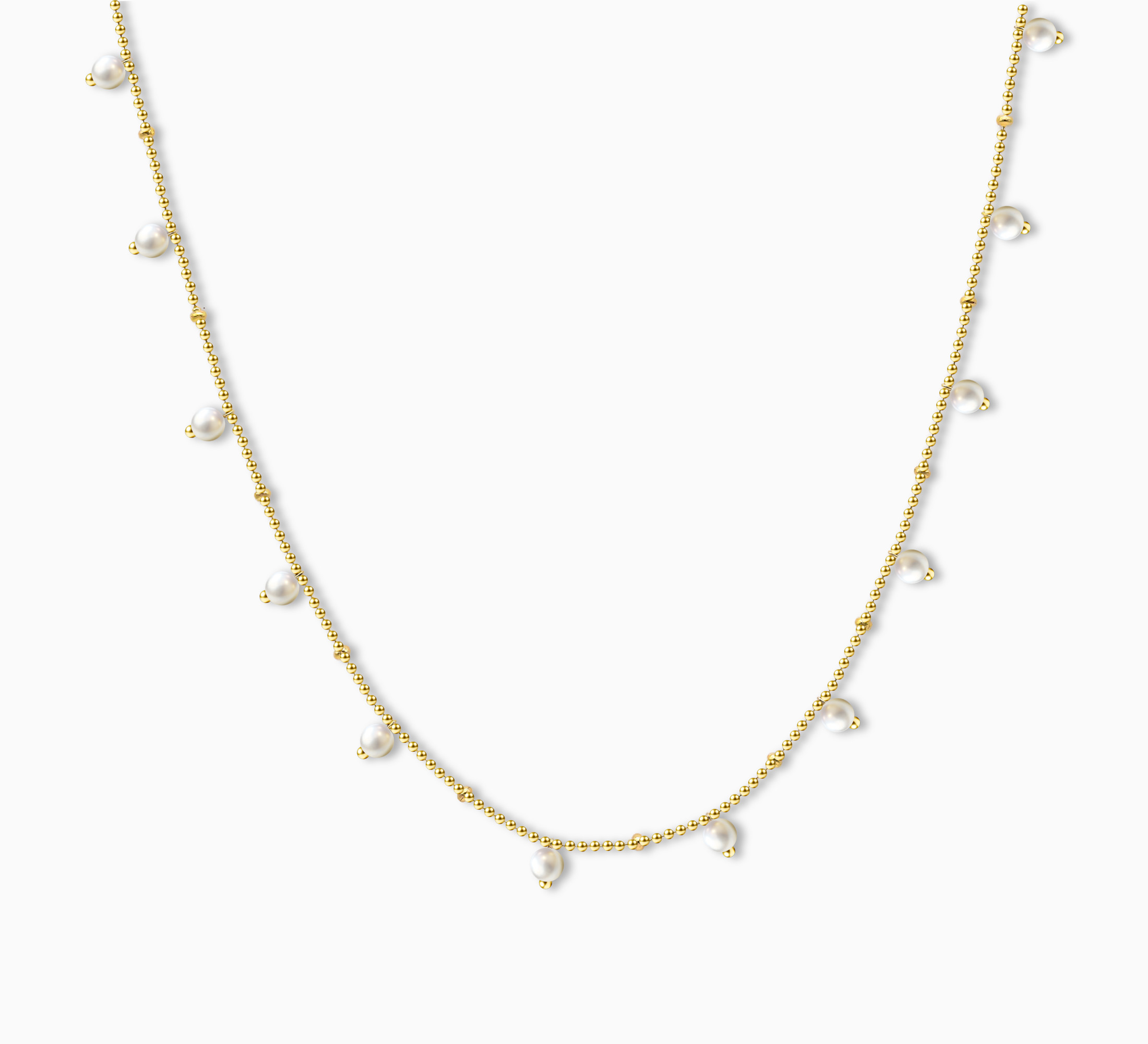 The Dewdrop Pearl Necklace pairs radiant golden beading with softly luminous imitation pearls. Each pearl drop floats gracefully along the delicate chain, evoking sunlight glinting on morning dew. With its effortless elegance and timeless charm, this piece is perfect for adding refined glow to both modern and classic ensembles. Lightweight and adjustable for perfect drape every time.
