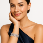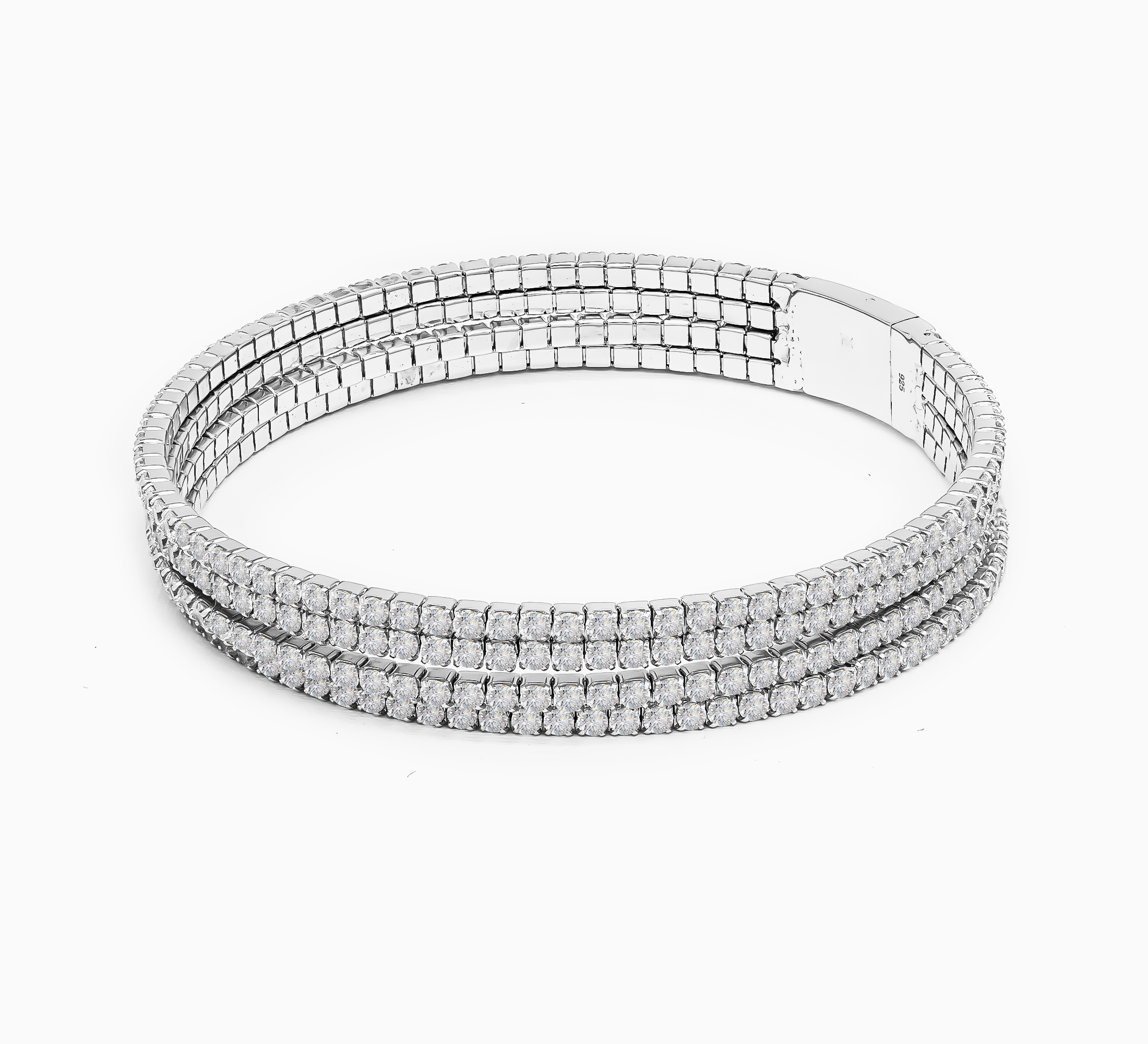 Radiate unapologetic glamour with the Eclat Triad Bracelet. Crafted from lustrous sterling silver, this striking design features three seamless rows of pave set cubic zirconia, offering multidimensional sparkle from every angle. With its structured elegance and luxurious weight, it transitions effortlessly from evening affairs to high fashion days.