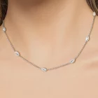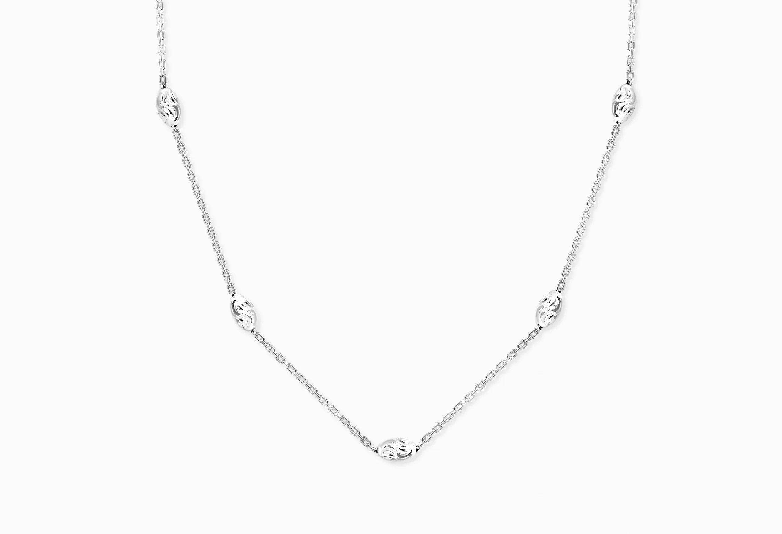 The Ellipse Necklace radiates timeless elegance with its sterling silver chain accented by sculpted oval stations. Each finely polished bead reflects graceful movement, creating a refined rhythm of light and shadow. A versatile design that layers effortlessly or shines alone, it embodies quiet luxury with lasting sophistication.