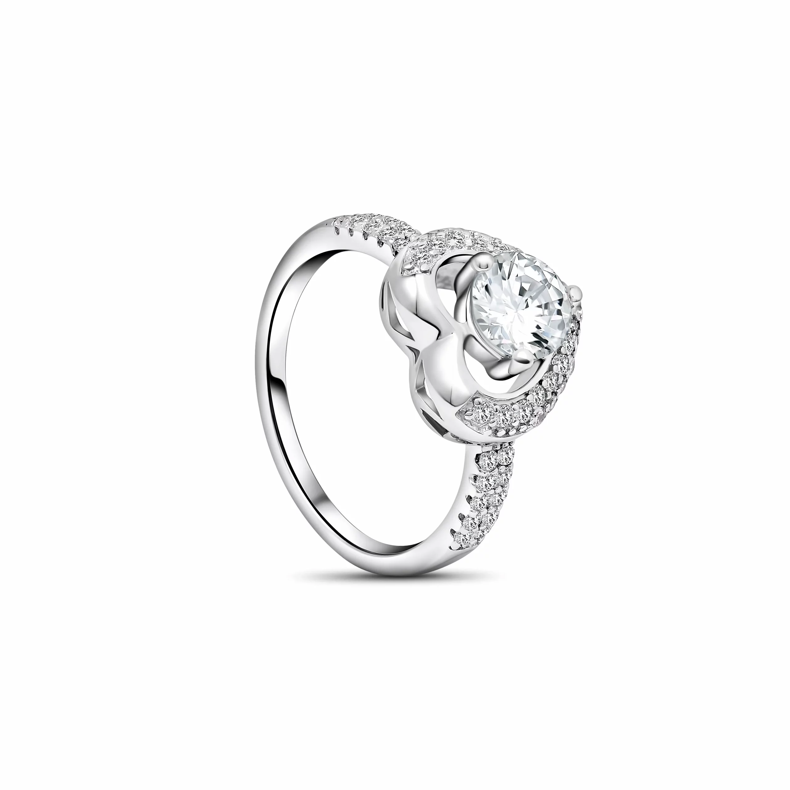 The Florielle Halo Ring is an exquisite tribute to timeless romance and sculpted artistry. Crafted in hallmarked 925 sterling silver, it features a luminous round cut cubic zirconia center embraced by a delicately sculpted, petal like pave halo that evokes a blooming flower in radiant detail.