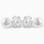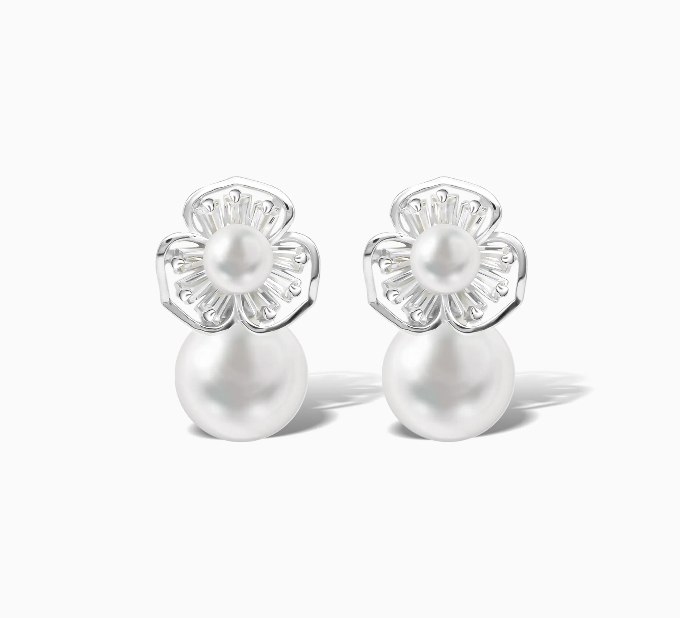 Elevate your accessory game with the Frost Bloom Stud Earrings. These beautifully crafted stud earrings highlight a polished silver floral frame, accented with tapered cubic zirconia baguettes for subtle sparkle. A glowing white imitation pearl sits at the center, mirrored by a larger drop pearl below adding a refined touch to both formal and casual looks.