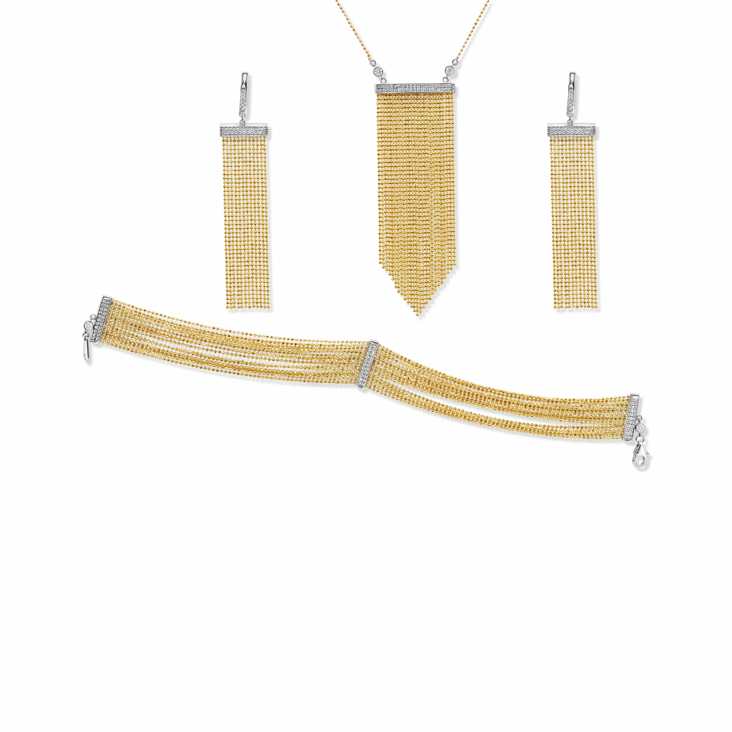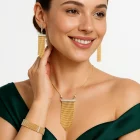 Make a dramatic entrance with the Gilded Cascade Ensemble, a striking set featuring a tassel style necklace, matching earrings and an elegant bracelet. Crafted with gold plated mesh and silver accented clasps, this set flows with fluid brilliance and architectural grace.