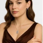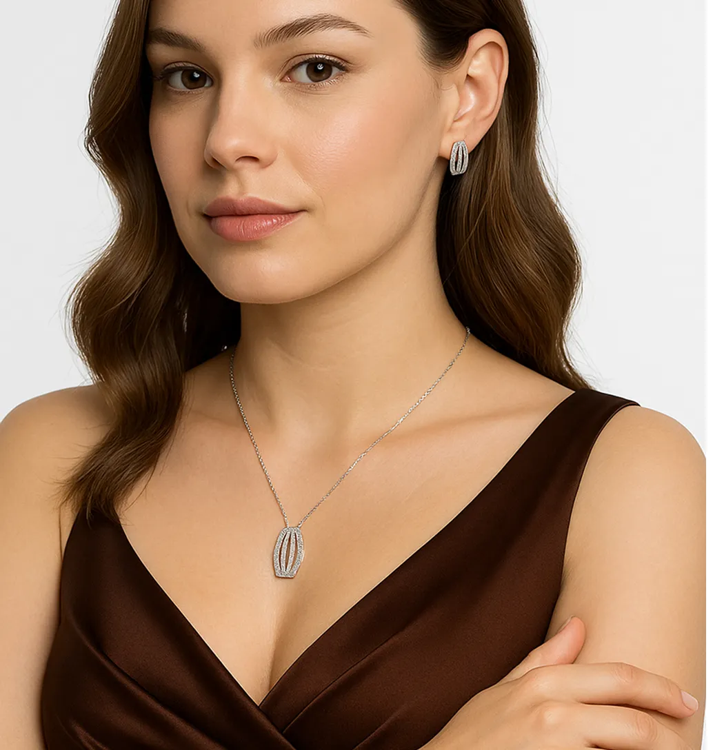 The Glacier Lantern Pendant Set channels winter light through sweeping pave arcs, forming a modern lantern silhouette. Handcrafted in solid 925 sterling silver, the pendant and matching earrings offer brilliant, everyday luxury sparkle perfect for work, weddings and gifting.