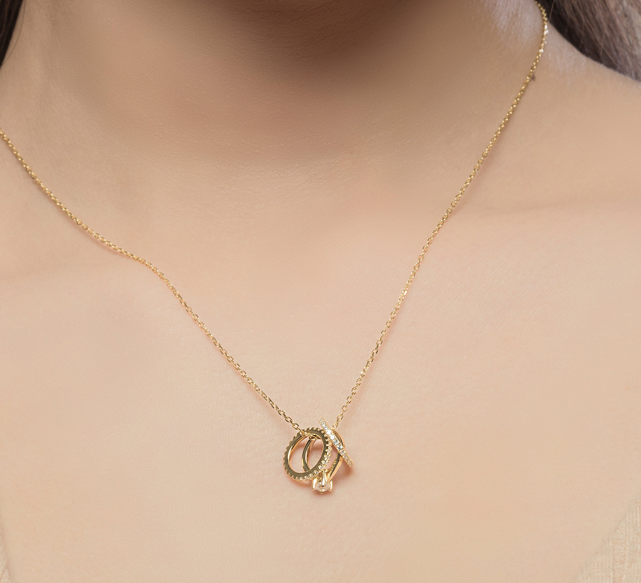 The Golden Embrace Pendant pairs modern minimalism with everyday sparkle. Two polished halos, one sleek, one pave set with brilliant cubic zirconia, slide together on a fine chain, finished with a tiny solitaire drop for extra shimmer. Crafted in 18K gold plated 925 sterling silver. Chic, timeless and ultra wearable, it’s the gold statement you will reach for again and again.