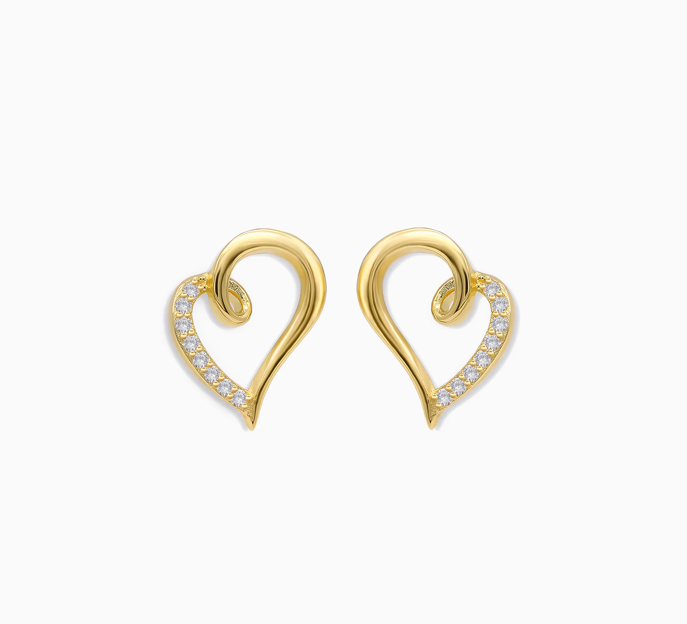 Celebrate love with a golden glow in the Golden Embrace Stud Earrings. These delicate open heart studs are crafted from gold plated 925 Sterling Silver, featuring a sculptural twist that symbolizes connection and affection. A row of clear cubic zirconia adds radiant sparkle along one side of the heart, catching the light with every movement.