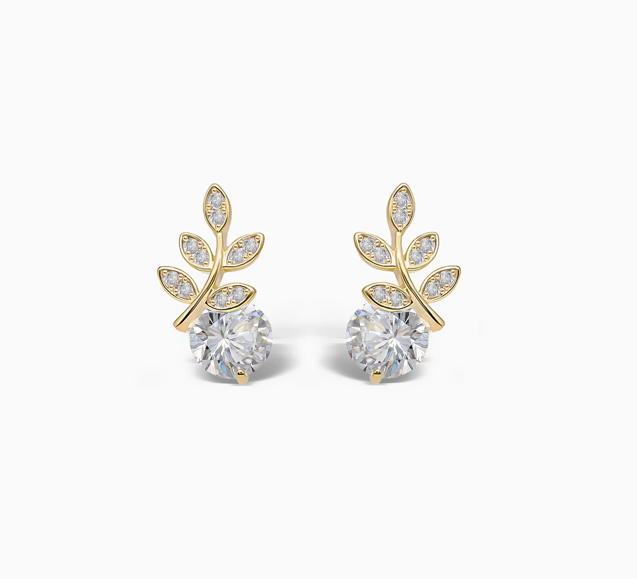 Add a touch of botanical brilliance with the Golden Vine Sud Earrings. Designed with delicate gold tone leaves studded with cubic zirconia, these earrings are anchored by a radiant round cut stone at the base. Ideal for everyday wear or dressy occasions, their elegant silhouette blends nature inspired charm with modern glamour.