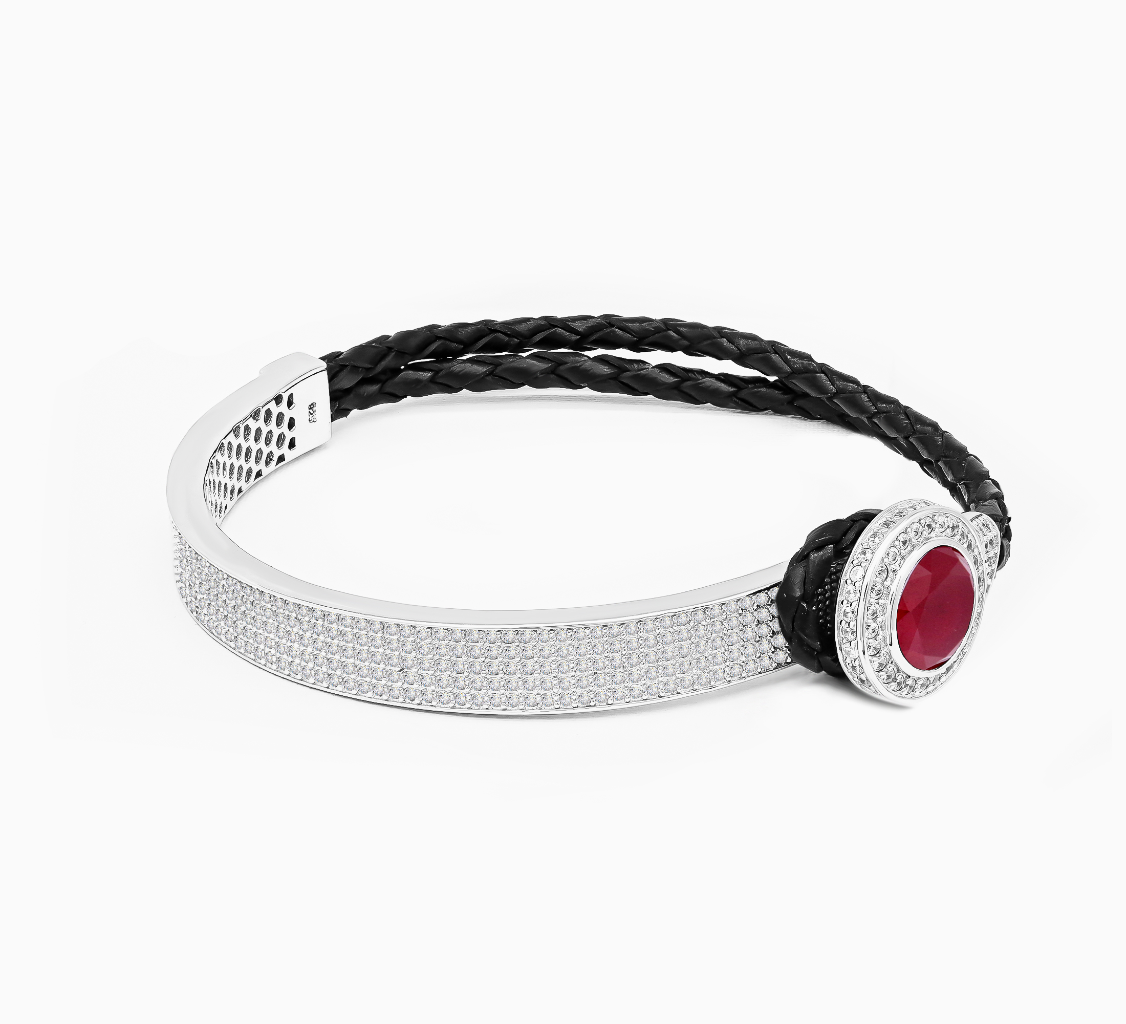 Command attention with the Imperial Radiance Bracelet, where fine craftsmanship meets bold elegance. A crimson cabochon gemstone, encircled by pave set brilliance cubic zirconia, anchors a sleek sterling silver cuff. Twin braided leather strands add tactile richness, merging modern with timeless sophistication. Ideal for global tastemakers, this piece redefines power dressing with a sculptural silhouette and luxurious detail.