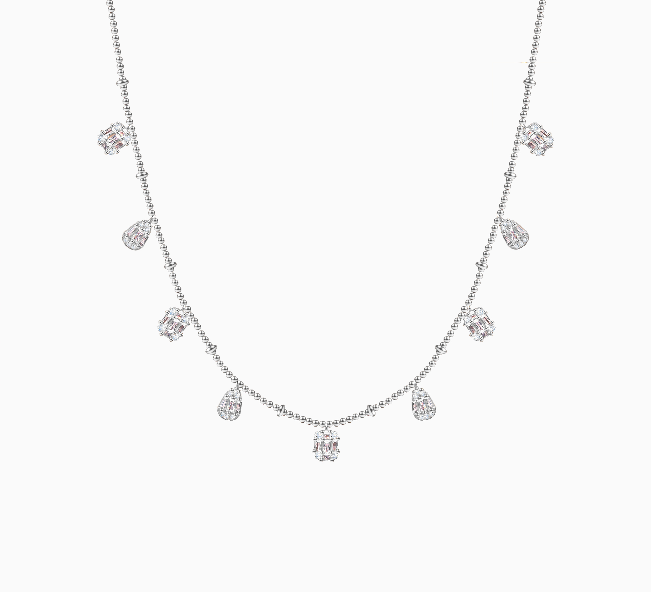 The Liora Necklace shimmers with refined brilliance, featuring alternating emerald cut and pear shaped pave set charms along a sterling silver chain. Each stone captures light in flowing harmony, creating a cascade of radiance. Perfect for layering or as a standalone statement of timeless sophistication.