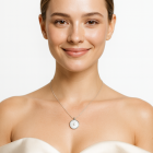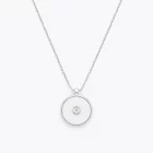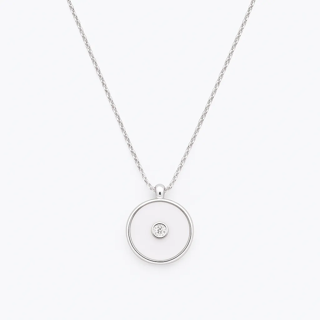 Clean, modern and quietly luminous. The Luna Blanc Orbit Pendant frames a bezel set cubic zirconia inside a polished sterling silver circle. A smooth white enamel disc sits behind the stone, amplifying its sparkle with a soft porcelain glow. Cast in 925 sterling silver, this minimalist pendant is refined enough for every day.