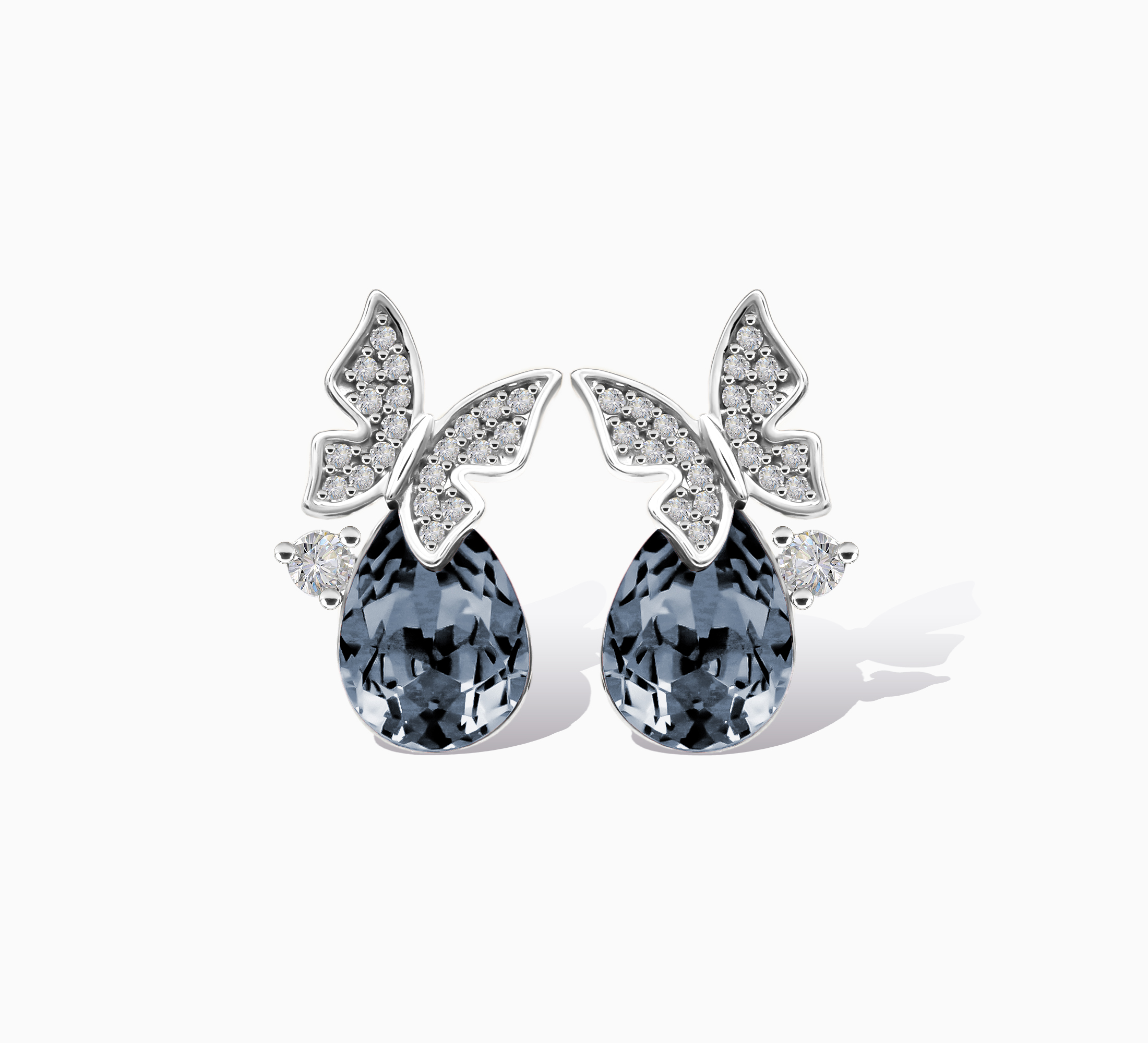 Let your style take flight with the Lunar Drift Stud Earrings, a sophisticated blend of celestial charm and modern design. These silver butterfly earrings feature intricately set pave stones and elegant grey teardrop crystals, offering a subtle shimmer reminiscent of moonlit nights. Perfect for evening events or elevating your everyday look, these dainty drop earrings strike the perfect balance between whimsy and elegance.