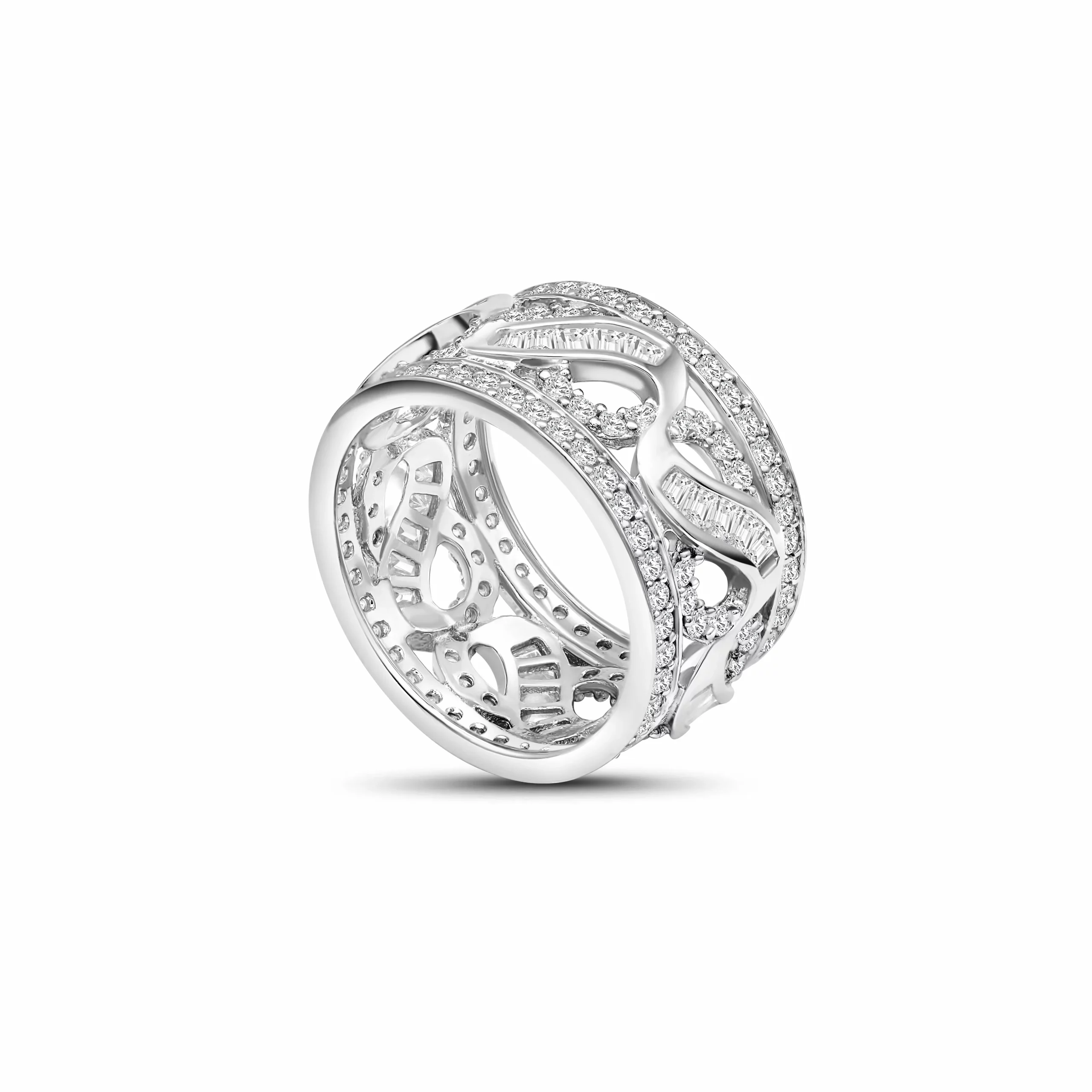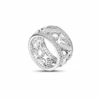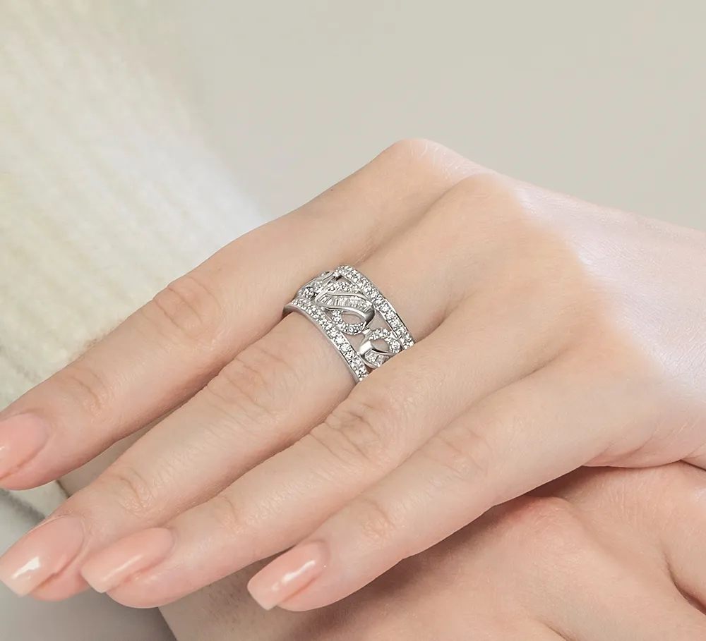 Inspired by botanical grace, the Lunara Bloom Ring is crafted from sterling silver and adorned with sculpted leaf motifs and shimmering cubic zirconia stones. Its wide band silhouette and intricate filigree offer timeless sophistication and modern charm. A perfect choice for women seeking an elegant, nature inspired ring to elevate everyday looks, bridal wear or fine jewellery collections.