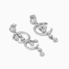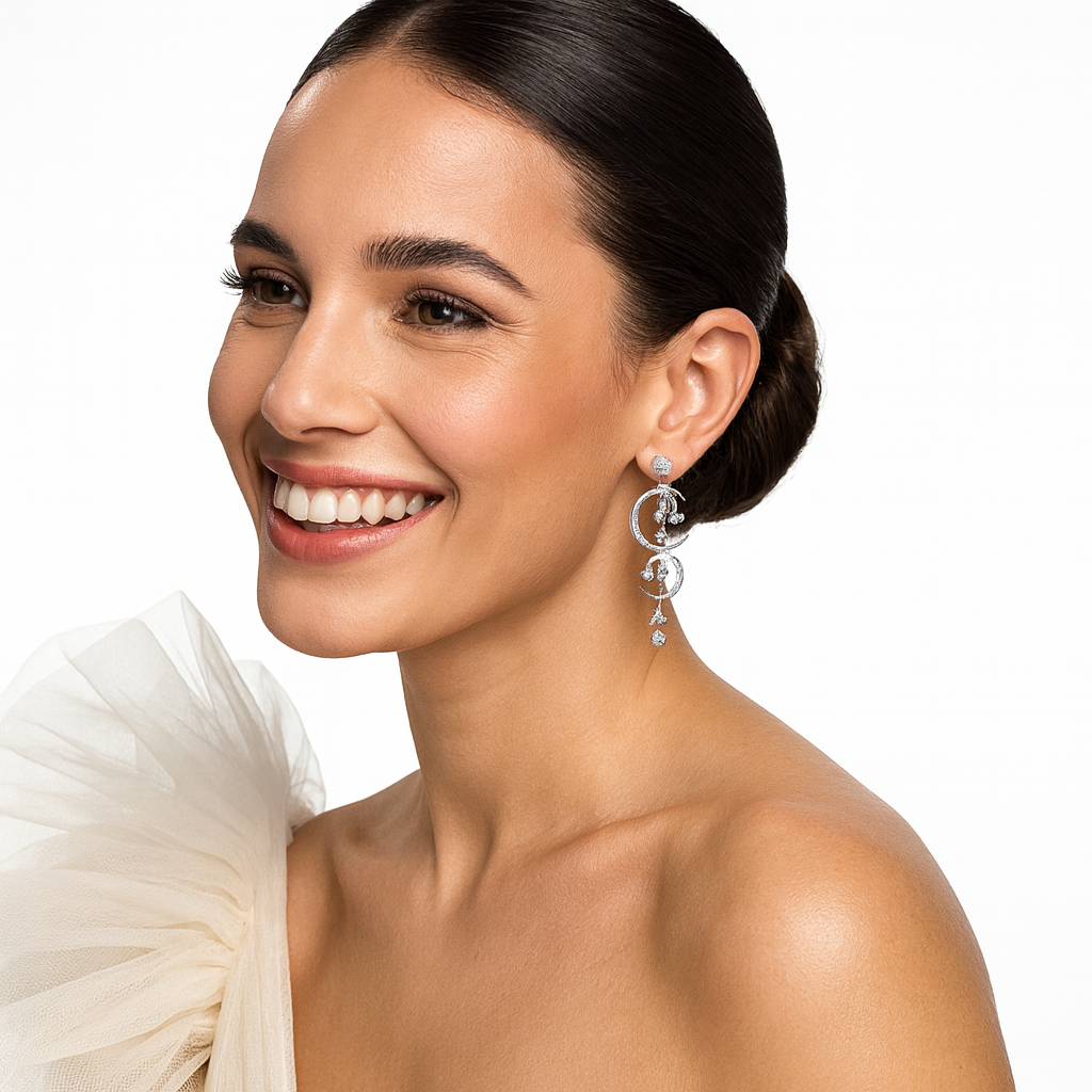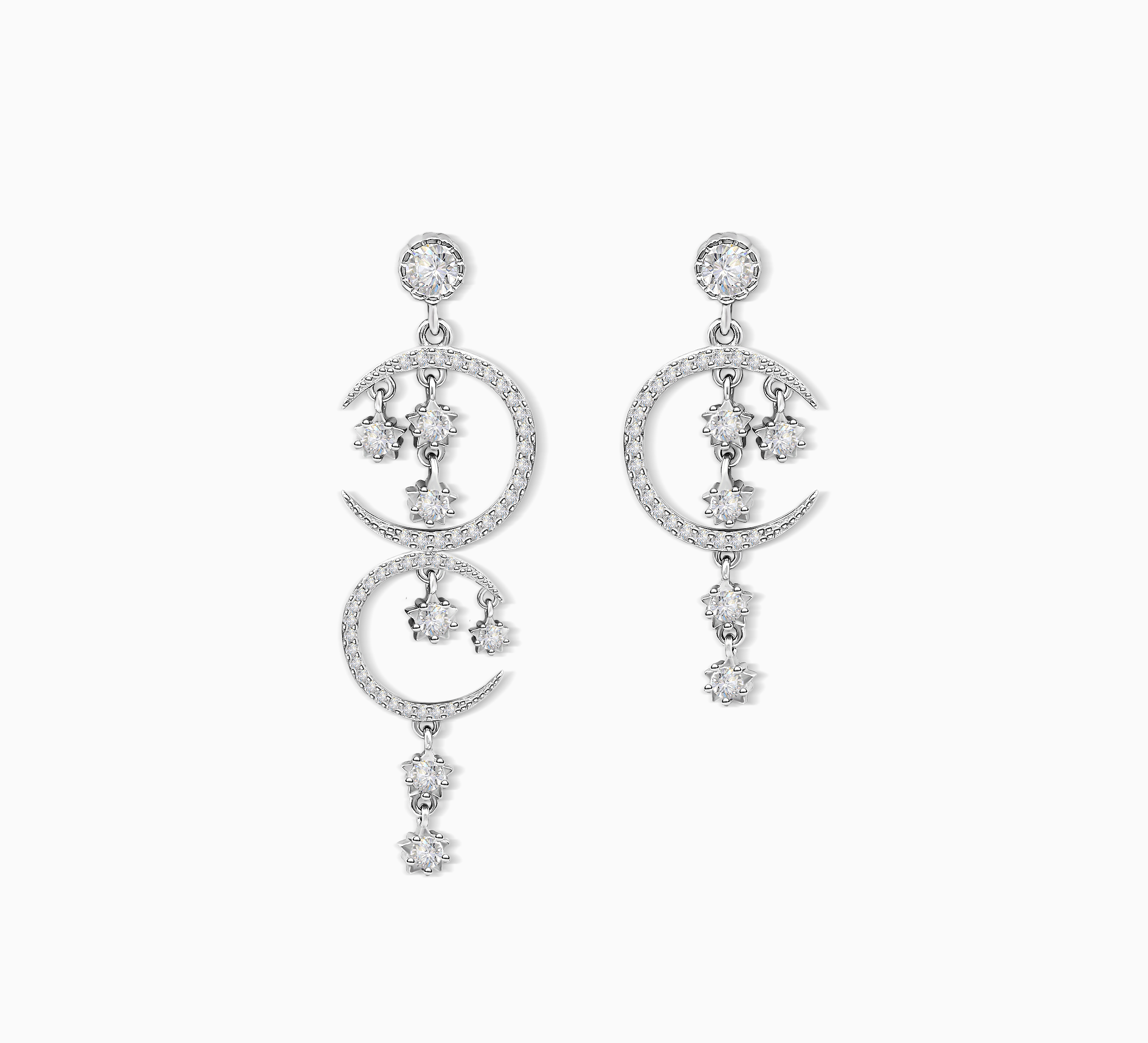 Unveil the magic of the cosmos with the Lunaria Cascade Drop Earrings, an ethereal pair of earrings inspired by the mystique of lunar light and stardust skies. These captivating statement earrings feature a dual crescent design, each crescent delicately pavé set with high shine cubic zirconia, evoking the moon’s radiant glow. Suspended from each crescent are star shaped zircon charms, dancing freely with every movement, an ode to the rhythm of the universe. Set in sterling silver, these earrings bring together dreamlike artistry and everyday elegance.