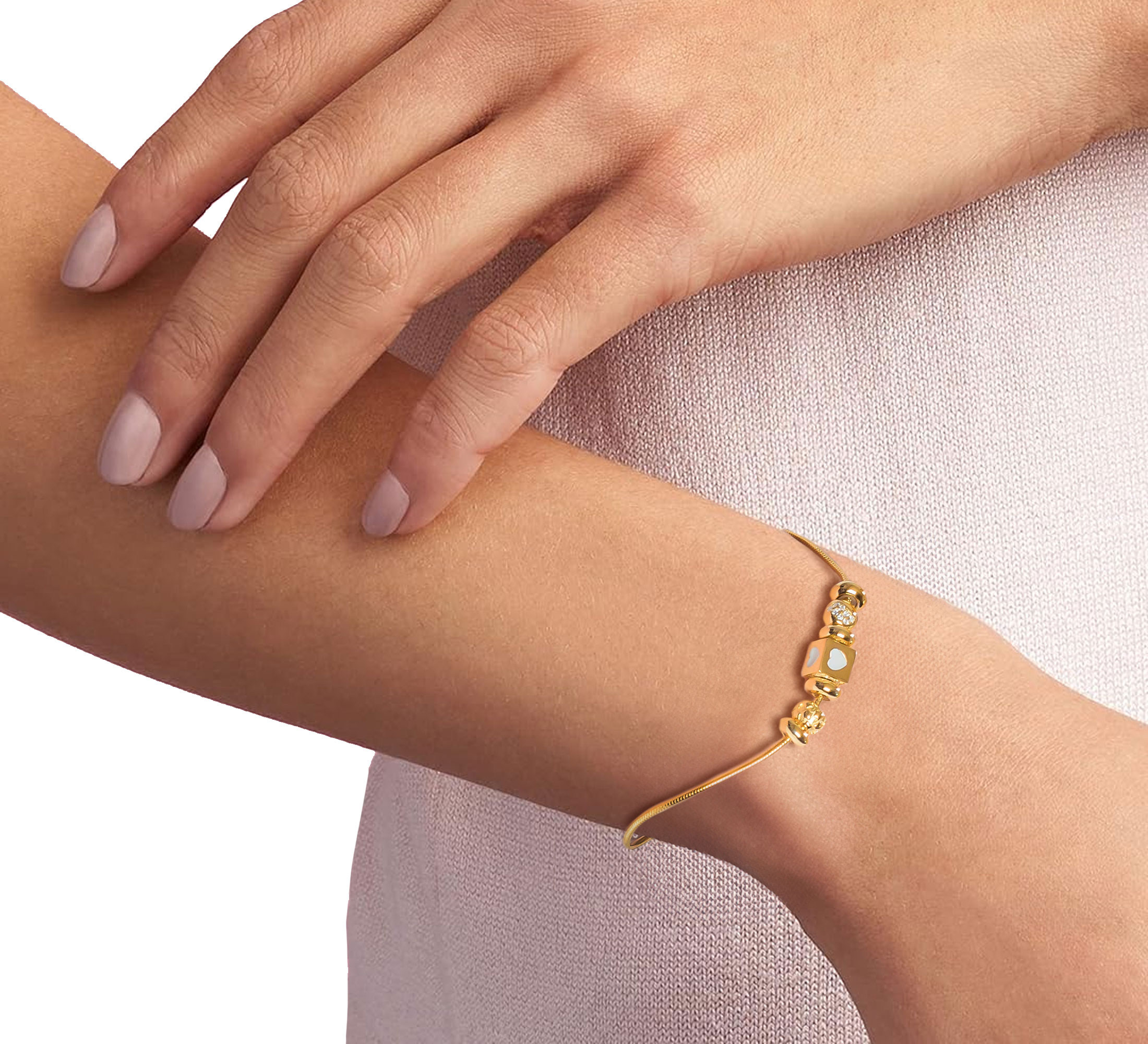 A chic blend of playfulness and elegance, the Lustre Heart Bracelet features a polished gold tone chain accented by faceted crystal beads and a heart etched dice charm. Perfectly adjustable for everyday wear, its gleaming design adds a refined touch to any look. Ideal for gifting or self-indulgence, this bracelet captures light and hearts, with effortless charm.