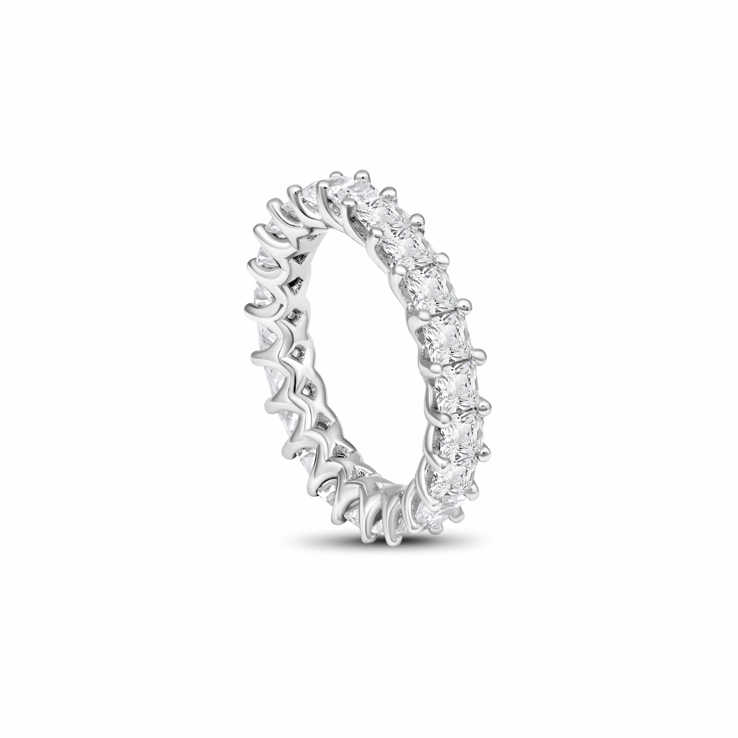 A study in structure and radiance, the Lyra Vault Band Ring elevates the classic eternity ring with an engineered prong setting and uninterrupted fire. Precision set round cut cubic zirconia encircle the finger, secured in a luminous sterling silver gallery designed for maximum light play. Bold enough to stand alone, refined enough to stack, this is modern elegance at full volume.
