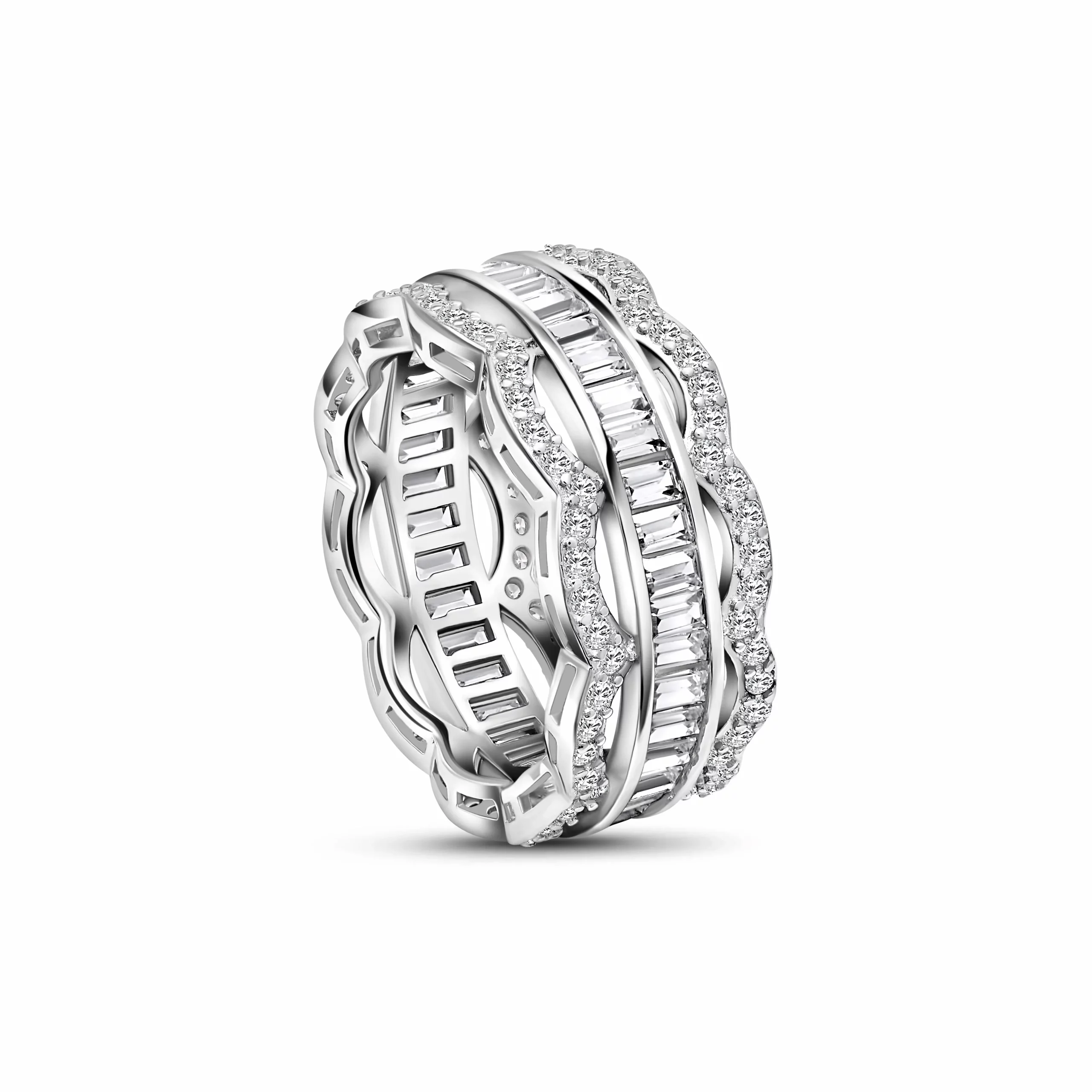 The Marcelline Wave Band is a stunning fusion of modern artistry and timeless luxury. Crafted in hallmarked 925 sterling silver, its sculptural design features fluid, interlaced curves adorned with pave set and baguette cut cubic zirconia for captivating, multidimensional brilliance.