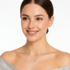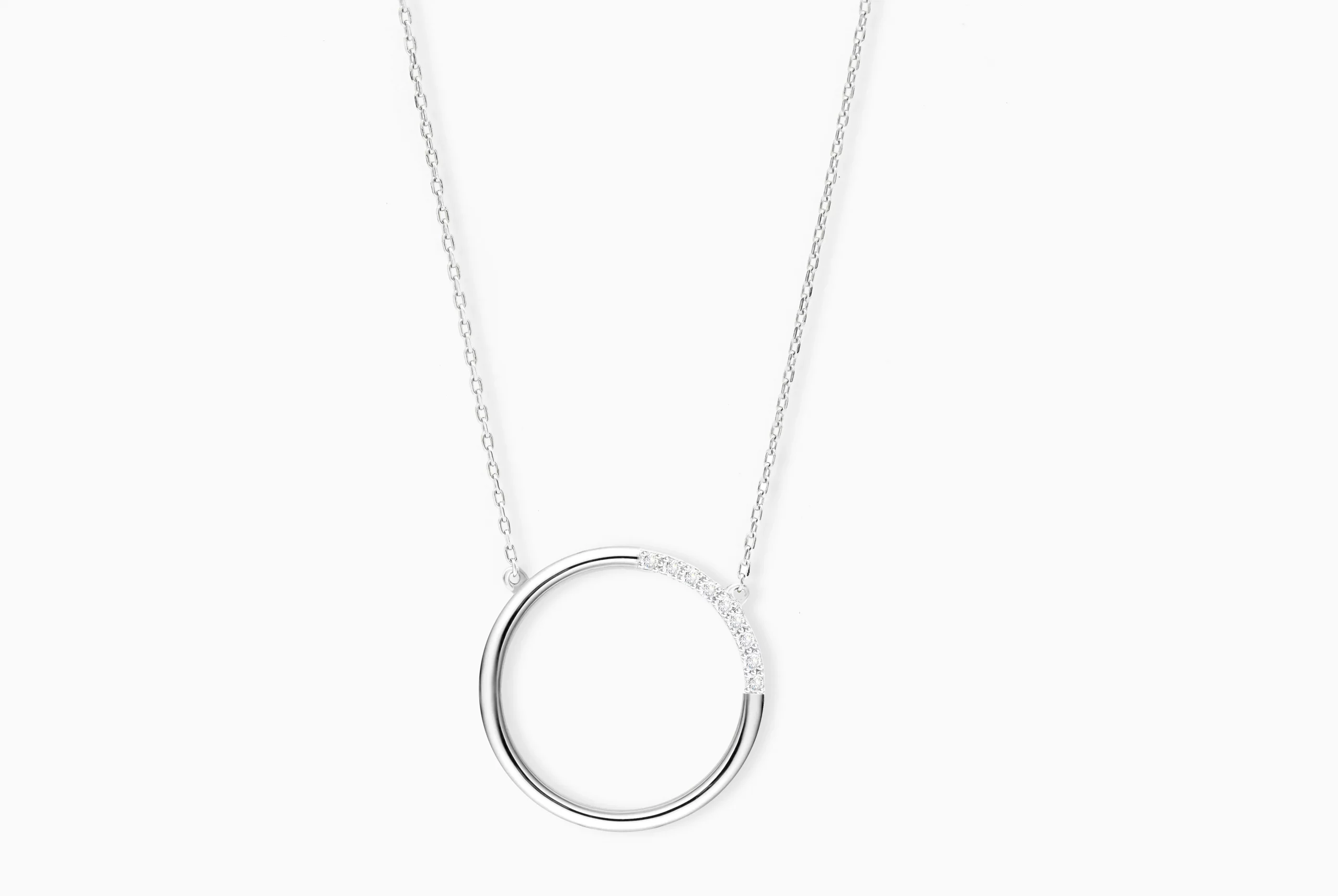 The Meridian Halo Pendant distills modern minimalism into a perfect circle. Crafted in luminous 925 sterling silver, the open halo is kissed by a hand set pave arc of cubic zirconia that catches the light with every move. This sterling silver circle pendant layers beautifully or makes a clean solo statement, equally at home with a tee or evening dress.