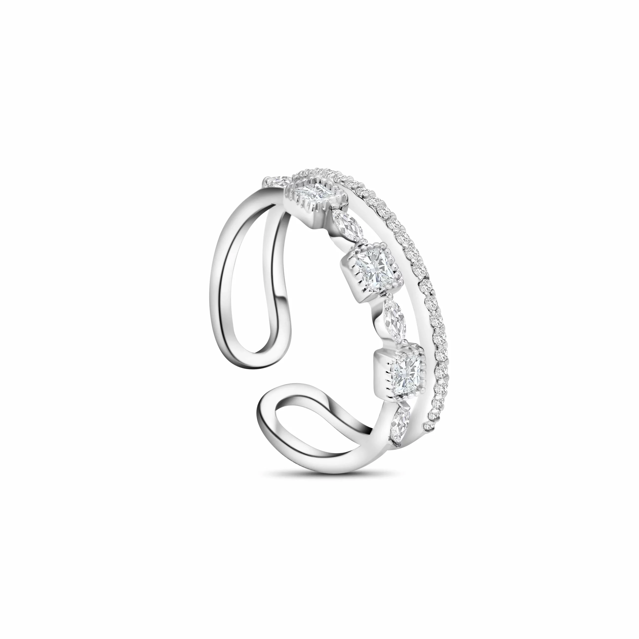 Sculpted like a constellation in motion, the Neriah Orbit Ring fuses open air architecture with dazzling precision. A dual layered sterling silver band curves around the finger, crowned with radiant emerald cut cubic zirconia and a pave set arc that glows with fine detail. Light, unexpected and utterly modern, this open ring speaks to those who orbit beyond tradition.