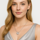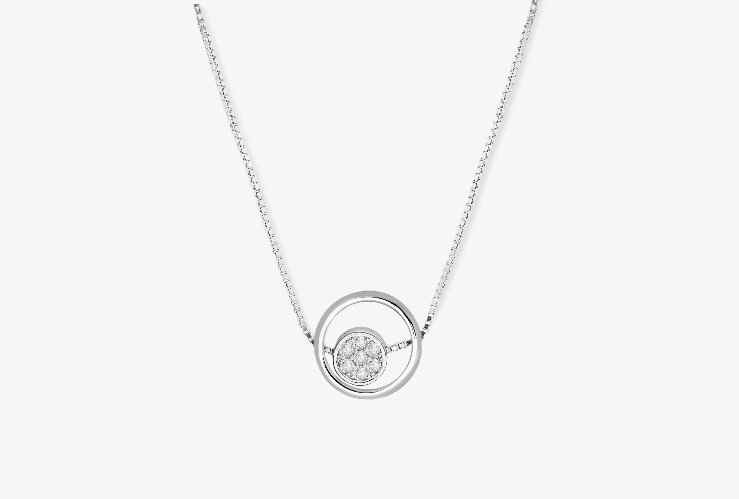 The Noctilune Orbit Pendant captures a moonlit glow in sleek, modern form. A luminous pave disc of cubic zirconia floats inside a sculpted double ring of 925 sterling silver, creating a refined moon in orbit effect that flashes with every move. Made to elevate everyday looks and special moments alike.