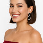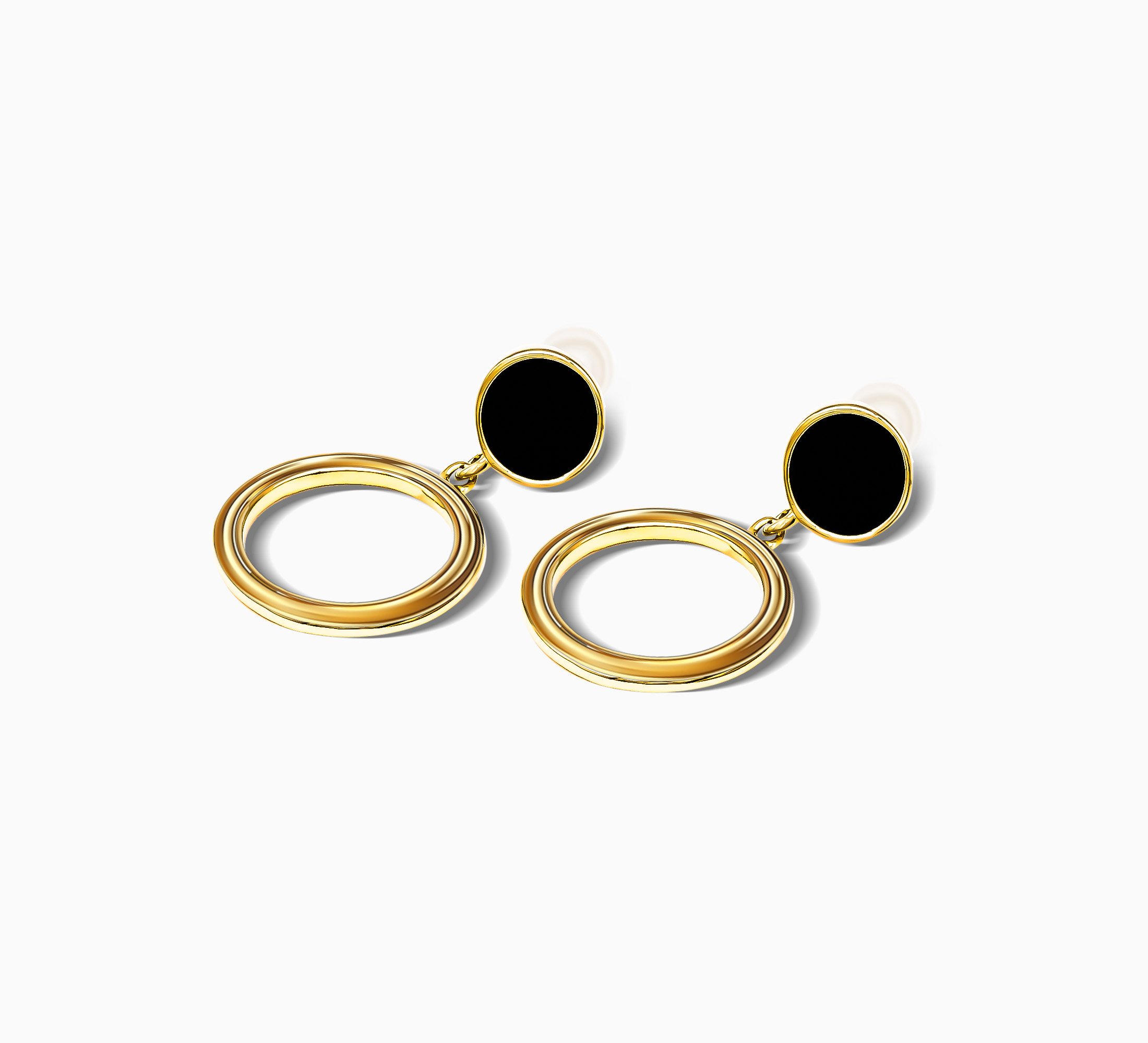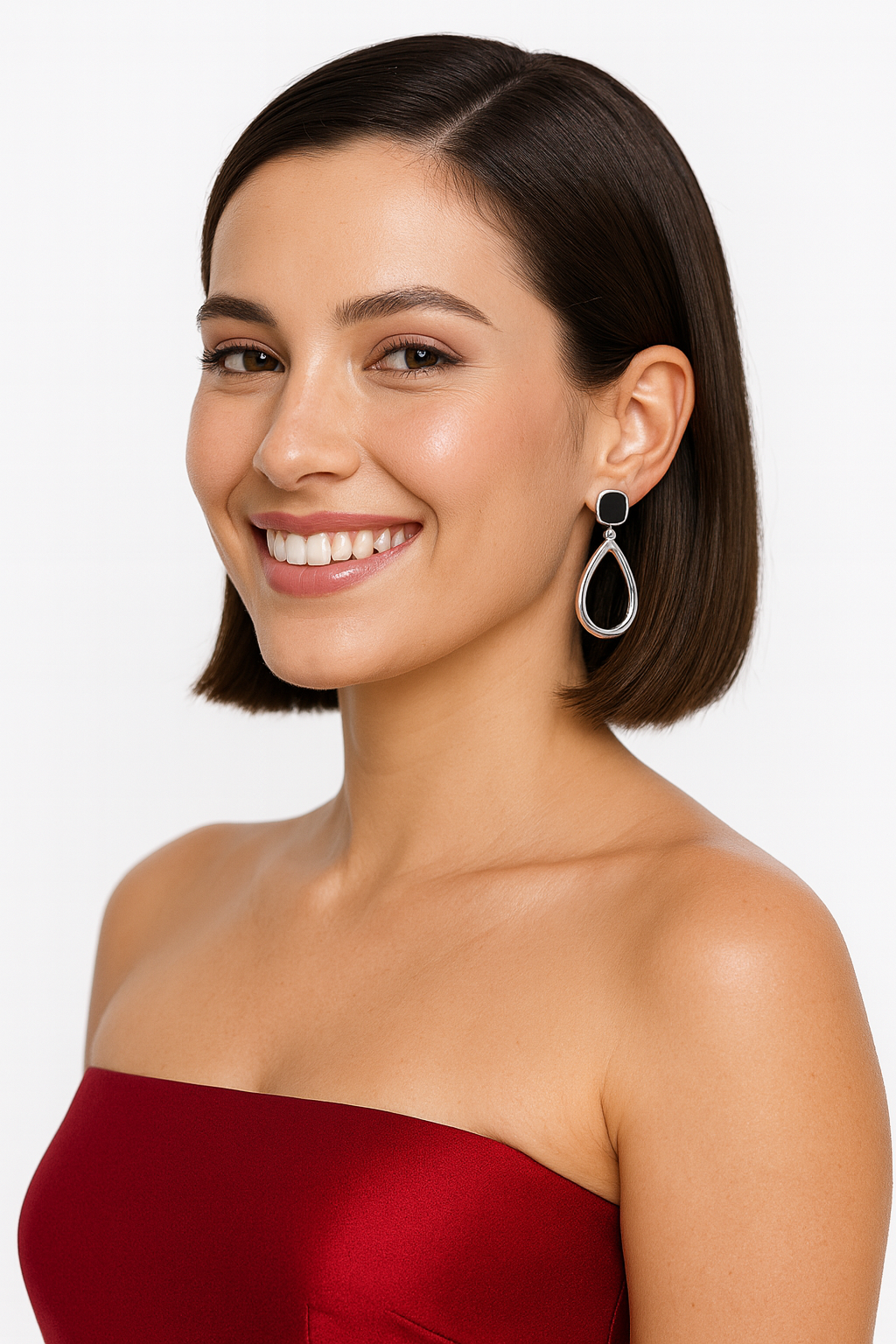 Introducing the Noir Halo Drop Earrings, a bold, minimalist statement piece designed for the contemporary woman. Featuring a cushion cut black onyx, inspired enamel stud and a sleek, teardrop, shaped open hoop in sterling silver, these earrings exude quiet luxury with maximum impact. Lightweight and fluid in movement, the open drop design frames the face with sculptural grace, while the black and silver contrast adds a modern, edgy appeal. Whether paired with a sleek blazer or an evening gown, the Noir Halo Drops elevate any look with their artful simplicity.
