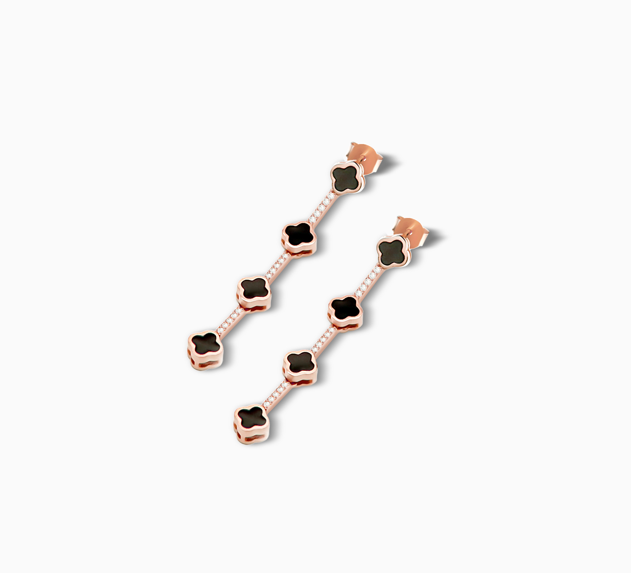 Unveil a new level of sophistication with NoireFleur Earrings, where modern craftsmanship meets symbolic beauty. Crafted in rose Gold Plating 925 Sterling Silver, each earring features five black enamel clover charms delicately suspended along a pave cubic zirconia accented spine.