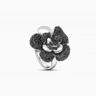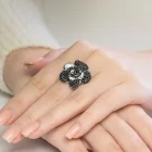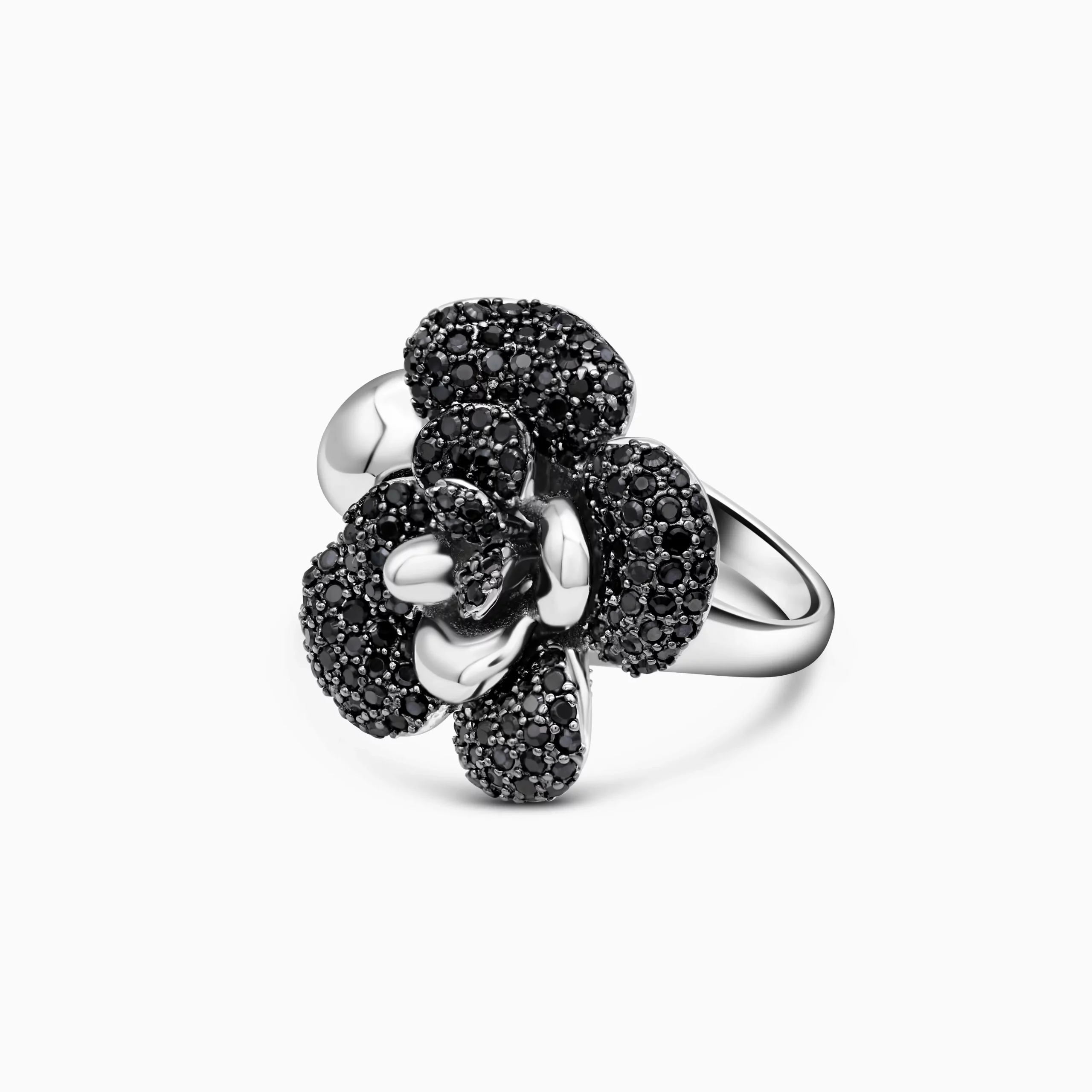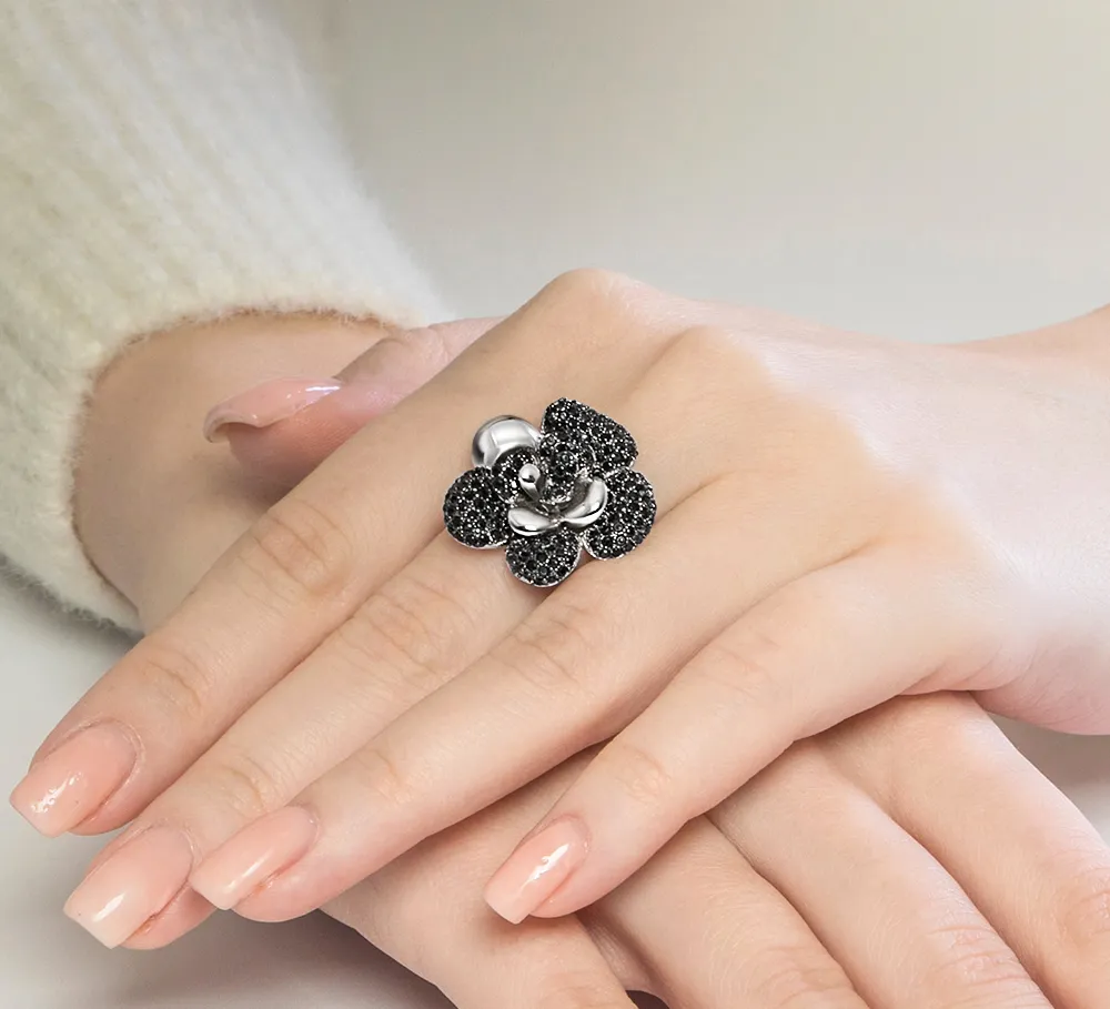 The Noirebloom Eclat Ring is where mystery meets bloom. This stunning sculptural piece features a dimensional flower fully encrusted with shimmering black cubic zirconia stones, blooming from a sleek sterling silver band. Each petal curves with lifelike detail, merging natural form with dramatic artistry.