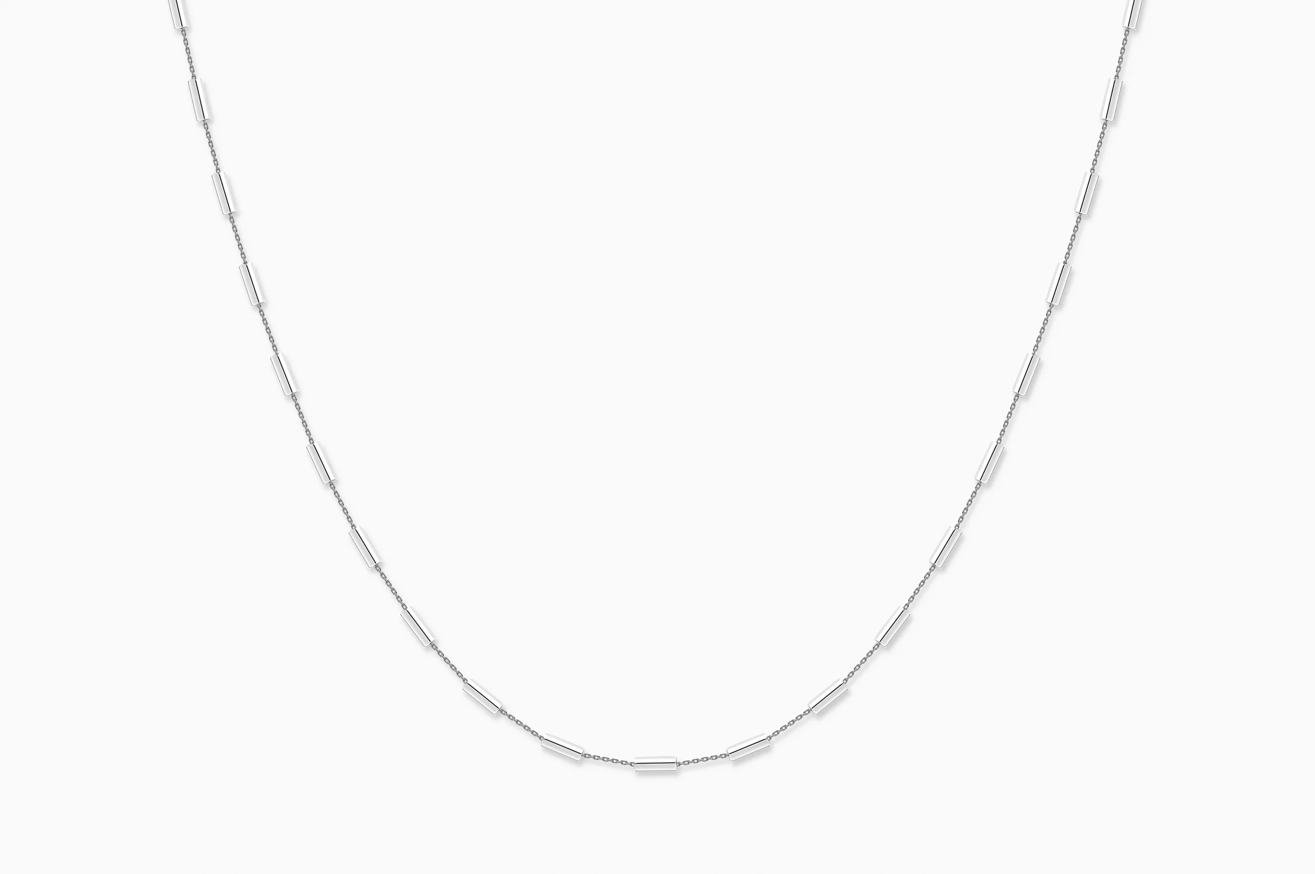 The Nova Bar Necklace embodies modern elegance with its refined sterling silver chain punctuated by polished bar stations. Each elongated link captures light with fluid brilliance, creating a rhythm of minimalist sophistication. Designed for layering or to shine as a subtle statement, it is a versatile piece that elevates every moment with understated luxury.