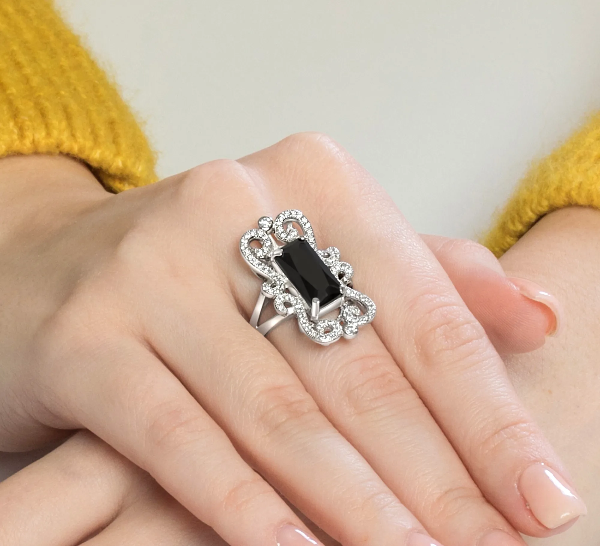 The Obsidian Baroque Empress Ring commands attention with dramatic elegance and regal charm. A deep, rectangular cut black center stone exudes mysterious allure, perfectly framed by intricate, vintage inspired sterling silver scrollwork adorned with sparkling clear cubic zirconia accents.