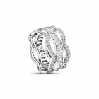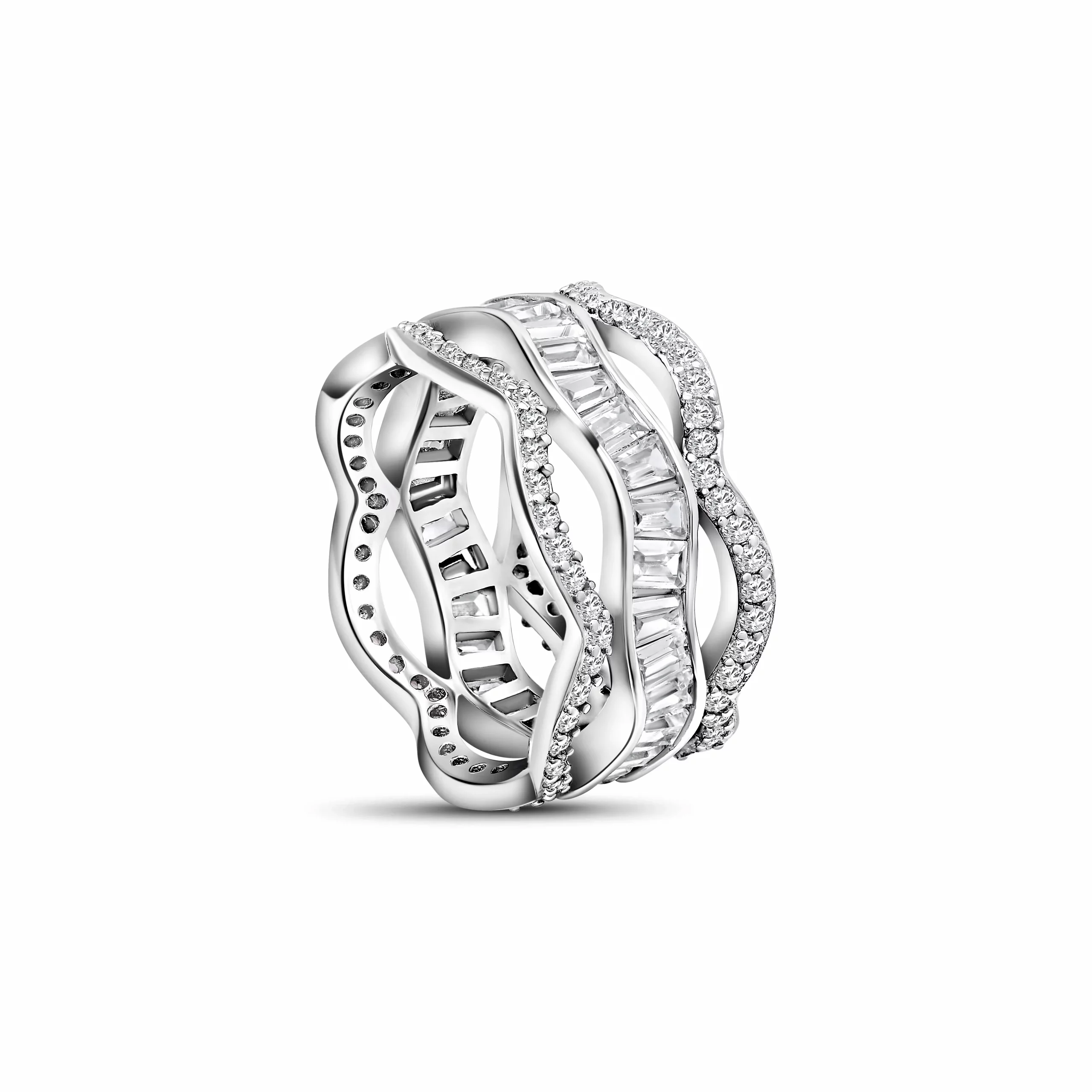 The Ondine Wave Band is an elegant celebration of fluid form and dazzling brilliance. Crafted in hallmarked 925 sterling silver, its sculptural layered curves are set with pave and baguette cut cubic zirconia, creating captivating, multidimensional sparkle. Inspired by the graceful movement of water, this sophisticated statement ring is perfect for adding modern luxury to any look.