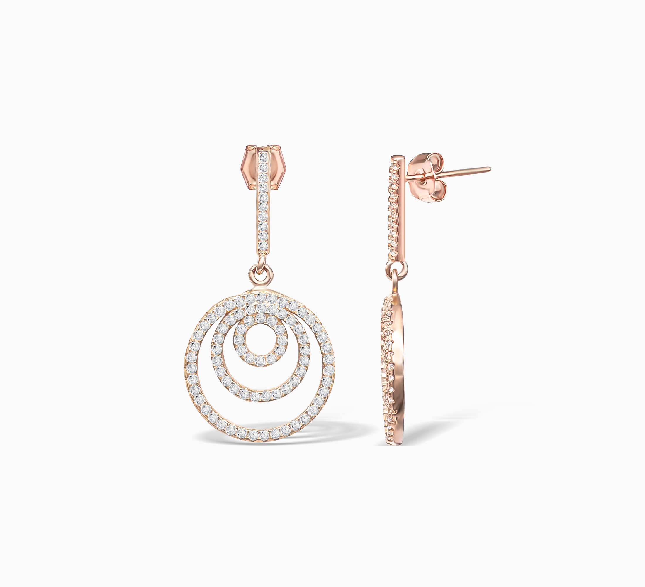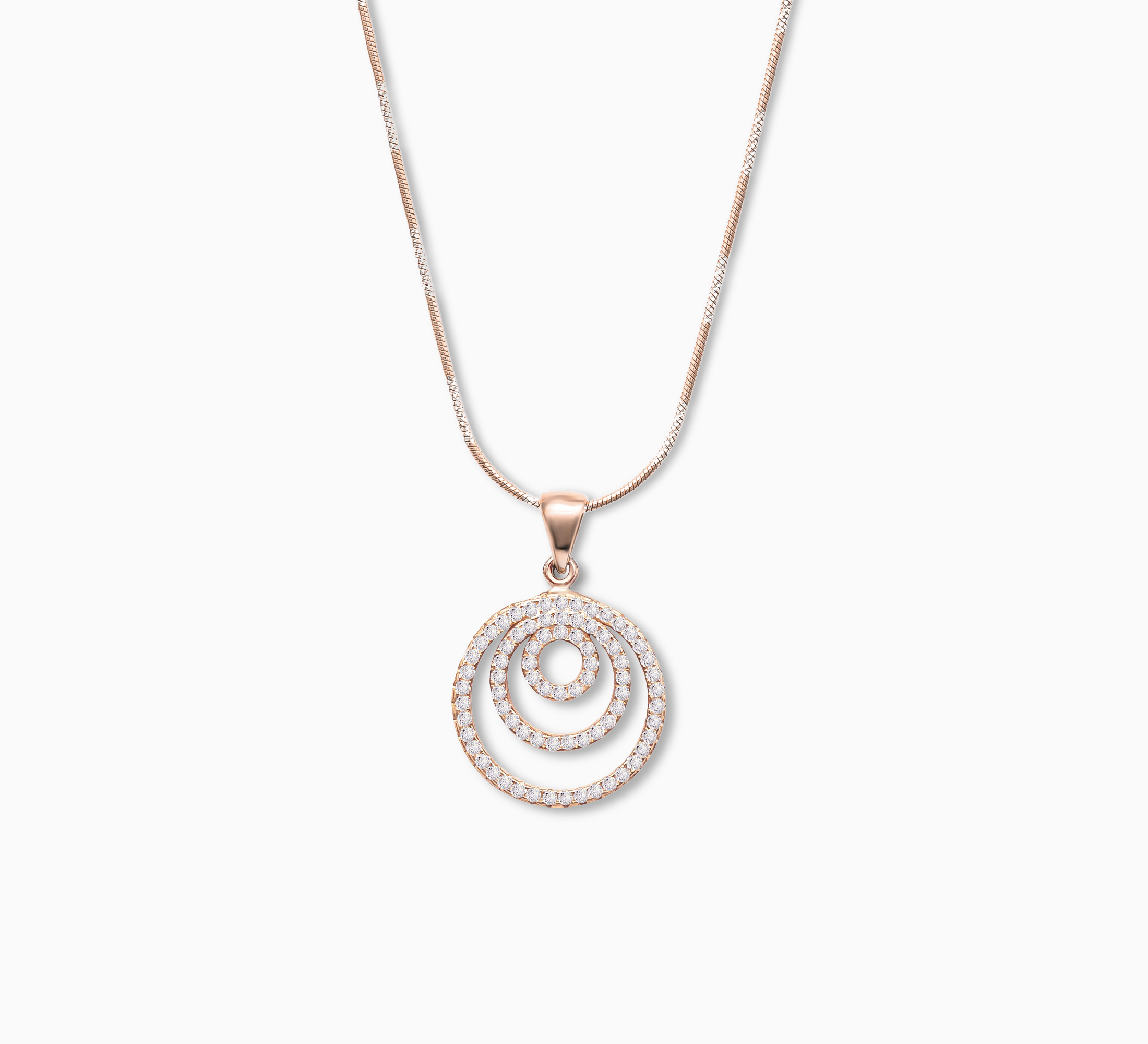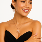 The Orbis Halo Pndant Set captures modern glamour in blush tones. Handcrafted in 925 sterling silver with luxurious rose gold plating, triple concentric halos of hand set pave cubic zirconia radiate fluid brilliance. The pendant, drop earrings and adjustable bracelet for women seeking luxury sterling silver jewelry that transitions flawlessly from daytime polish to evening sparkle.