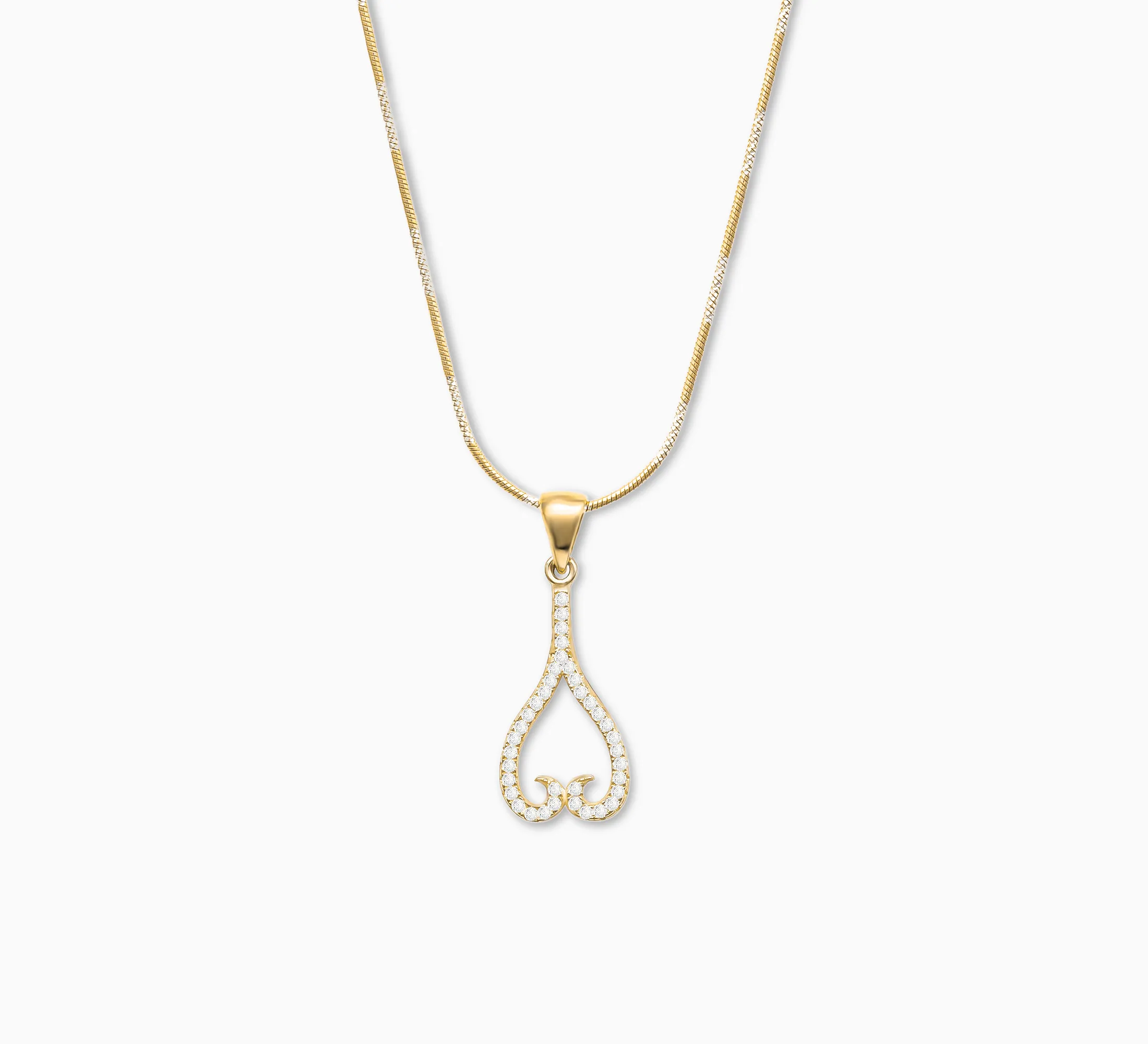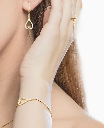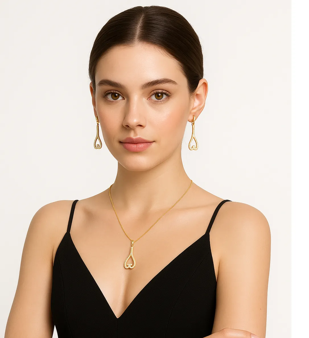 The Orliane Parure Pendant Set distills romantic minimalism into a complete luxury set. Handcrafted in 925 sterling silver with rich gold plating, airy arabesque hearts are illuminated by hand set pave cubic zirconia. The pendant, drop earrings, ring and adjustable bracelet form a cohesive, gift ready ensemble for women seeking designer gold plated sterling silver jewelry, refined for day, radiant for evening.