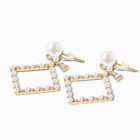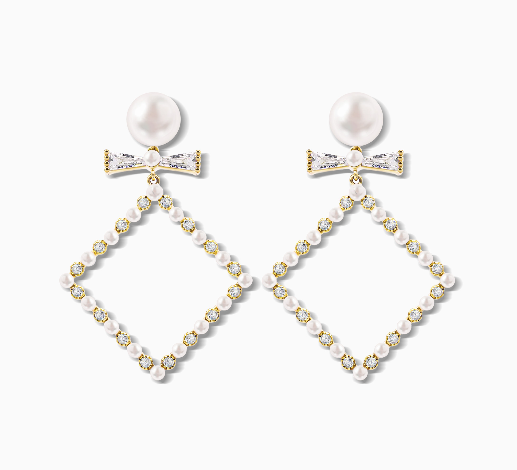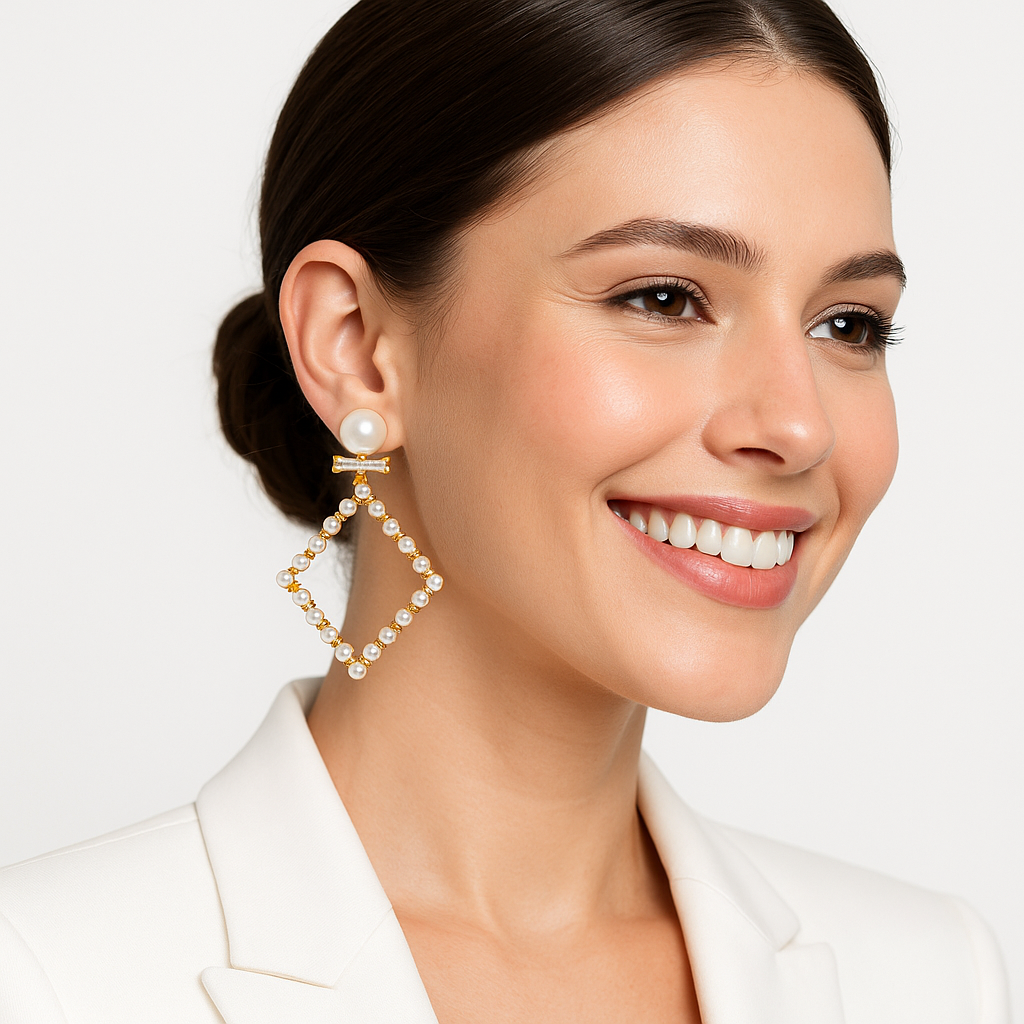 Introducing the Prism Pearl Earrings, a dazzling blend of vintage charm and architectural elegance. These statement earrings feature a bold diamond shaped drop meticulously outlined in alternating white imitation pearls and sparkling cubic zirconia stones, creating a frame that floats with regal grace.